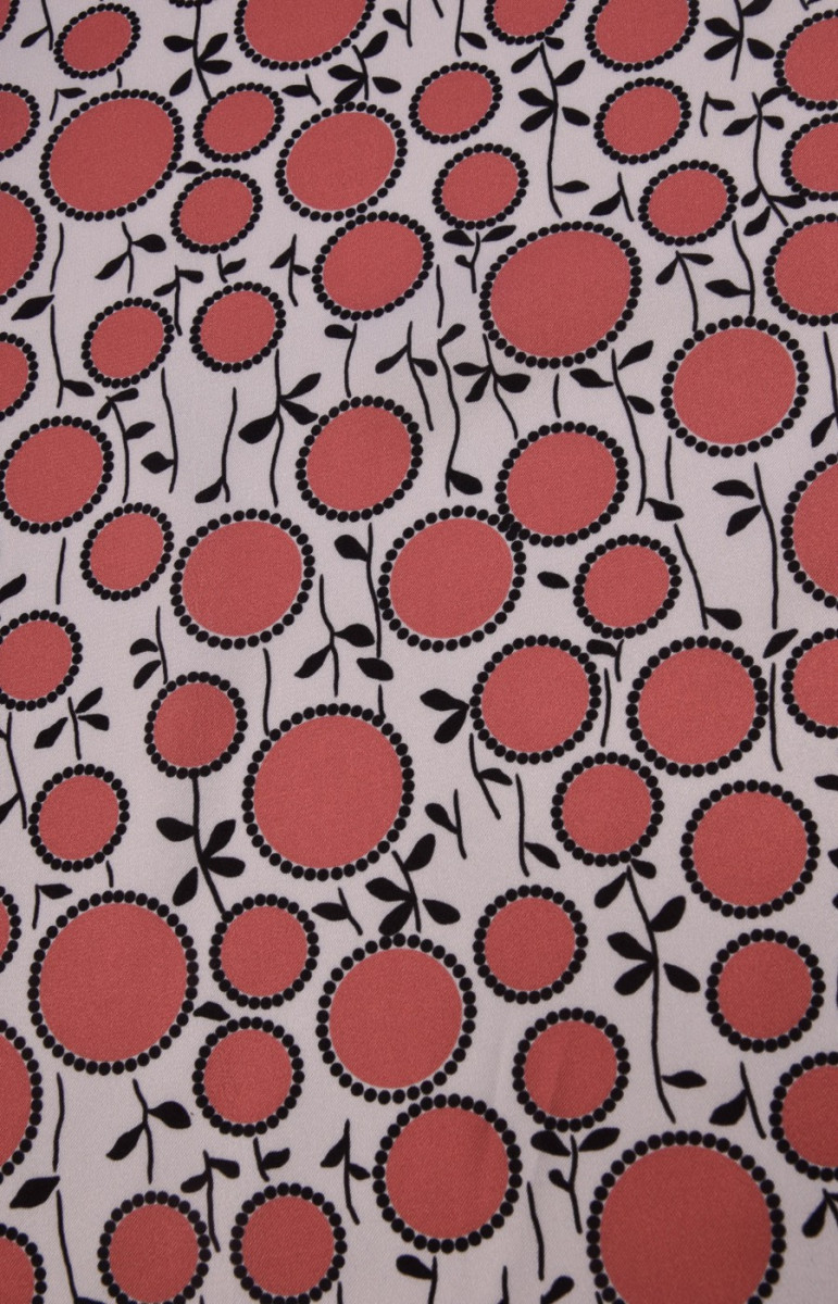 Szatén poliészterből, sűrű mintával - körök 1,5-2,5 cm. Javasoljuk, hogy varrjon belőle nyári ruhákat, blúzokat és szoknyákat. Nem átlátszó, varrhatja béleletlenül. A grammage női ingek varrására is alkalmas. Színek: Lazacszínű körök ecru háttéren.