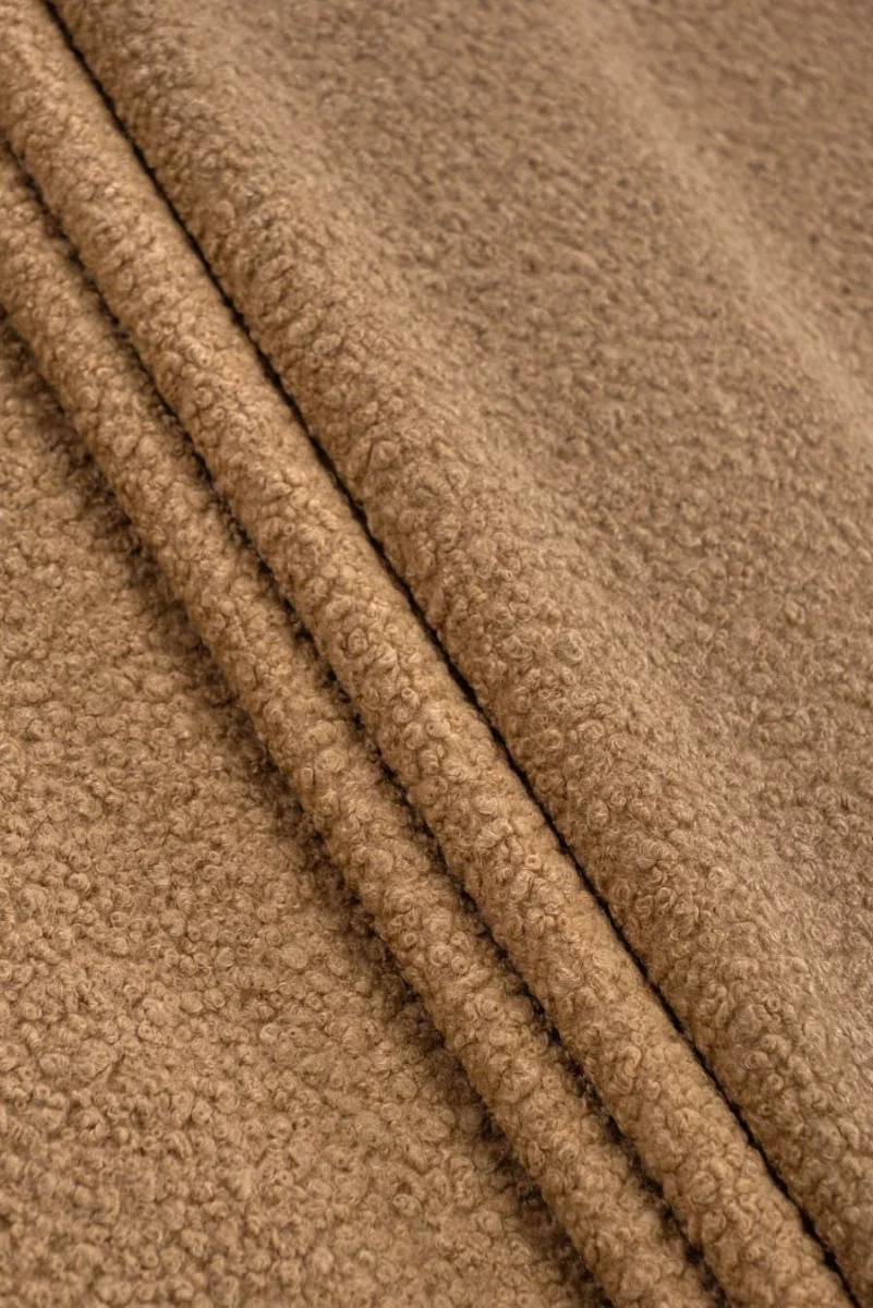 Olasz boucle kabátszövet teve színben. A szövet vastagabb, húsosabb, jellegzetes textúra.
