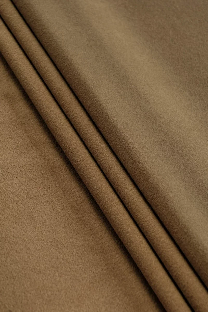 Olasz kabátszövet sötét, piszkos teve színében. 80% természetes gyapjúból és 20% kasmírból szőtt. A gyapjúszövetek ideálisak felsőruházathoz (kabát, kabát, mellény), mert melegítik és ugyanakkor lehetővé teszik a bőr lélegzését. A kasmír hozzáadása még jobban szigeteli, mivel a kasmír melegebb, mint a juh gyapjú.
