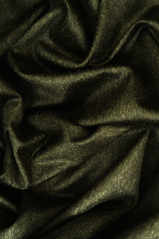 Olasz vergin gyapjú sötétzöldben, amely könnyebb szőrszálakkal törött. Nagyon puha, nemes anyag, finom ragyogással és rövidebb, préselt halommal, tökéletes őszi-téli kabát, kabát vagy meleg mellény varrására. A legjobb minőségű kompozíció miatt az anyag nemcsak szép, hanem nagyon meleg is. A szövet tökéletes azok számára, akik szeretik a klasszikusokat a legmagasabb kiadásban.