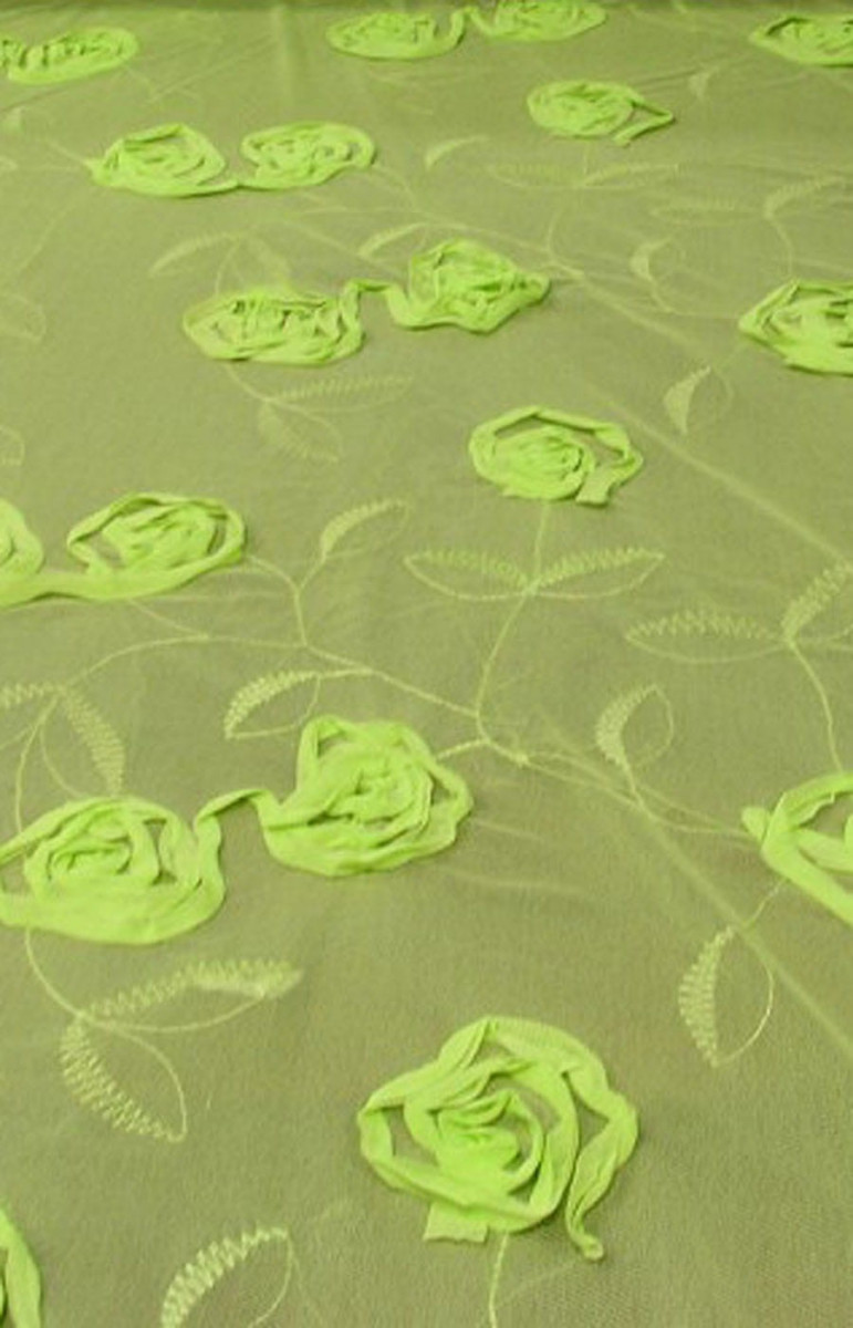 Kiwi színű tüll szalagokból varrott virágokkal. Lehetőség ruhák, blúzok, táncruhák varrására vagy dekoratív anyagként.