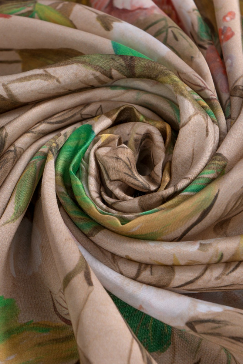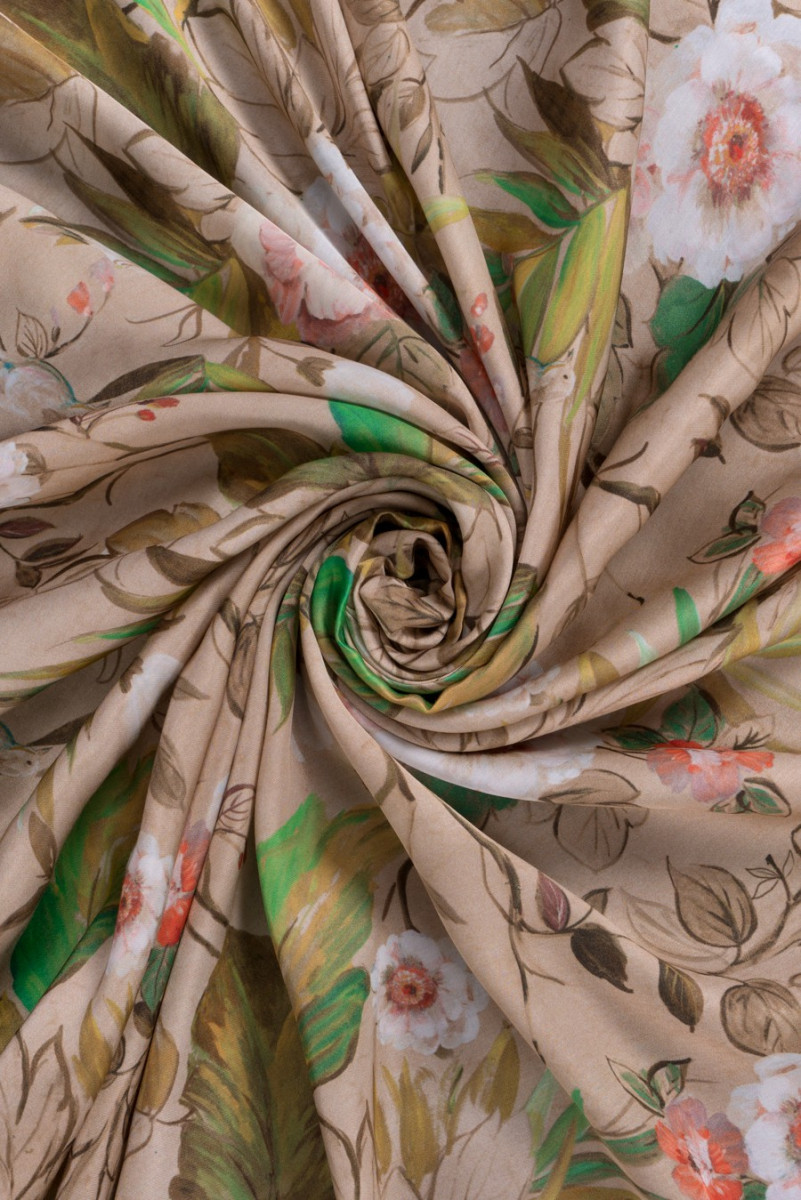 Nagyon jó minőségű olasz viszkóz szövet. Virágmotívum bézs alapon. Színek: bézs, zöld, fehér, khaki, narancs, barna.