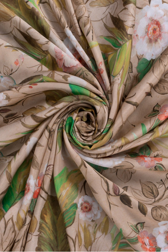 Nagyon jó minőségű olasz viszkóz szövet. Virágmotívum bézs alapon. Nem rugalmas, vastagabb, puha, szatén anyag. Tökéletes blúz, ruha, szoknya varrásához. Színek: bézs, zöld, fehér, khaki, narancs, barna.