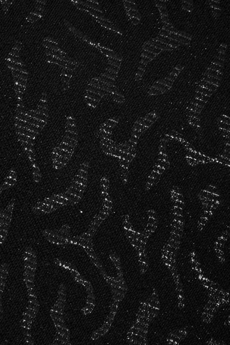 Olasz, eredeti viszkóz szövet fekete és ezüst színben, állati nyomattal. A szövet kissé merev, feszes, gyengéden működik. Ajánlott kabátok, dzsekik varrásához vagy dekoratív anyagként