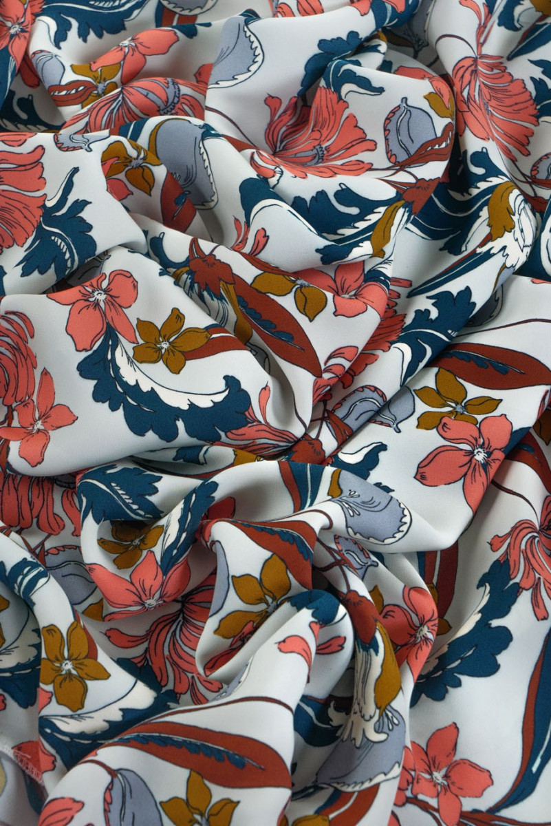 Olasz szövet 100% cadi viszkóz. Színes virágok motívuma piszkos menta háttéren. Nehéz, áramló, nem rugalmas anyag - tökéletes ruha, blúz, szoknya varrásához.