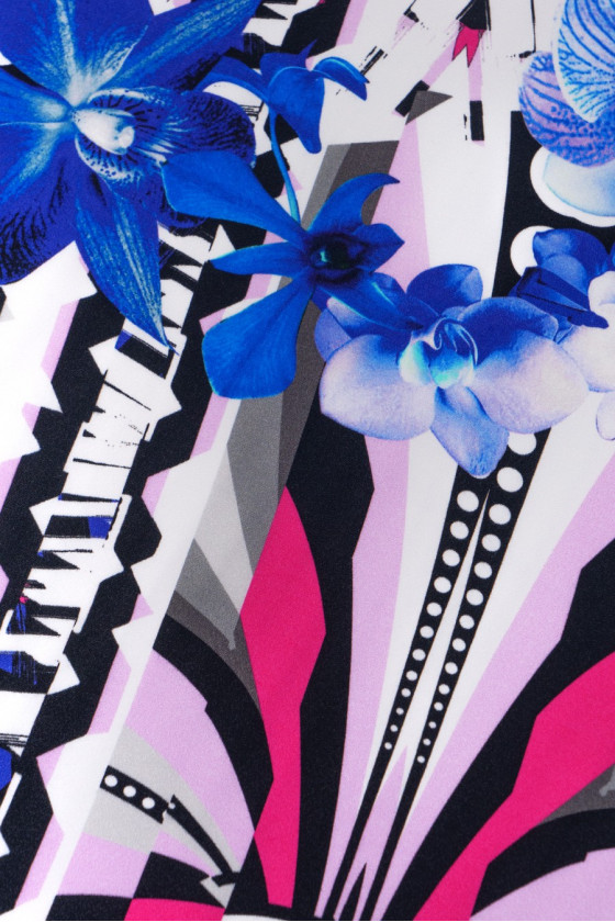 Olasz szövet 100% viszkóz georgette szövéssel. Érdekes motívum a virágok és a geometriai minták fehér alapon. A szövet 108 cm * 155 cm méretű kuponban kerül forgalomba.