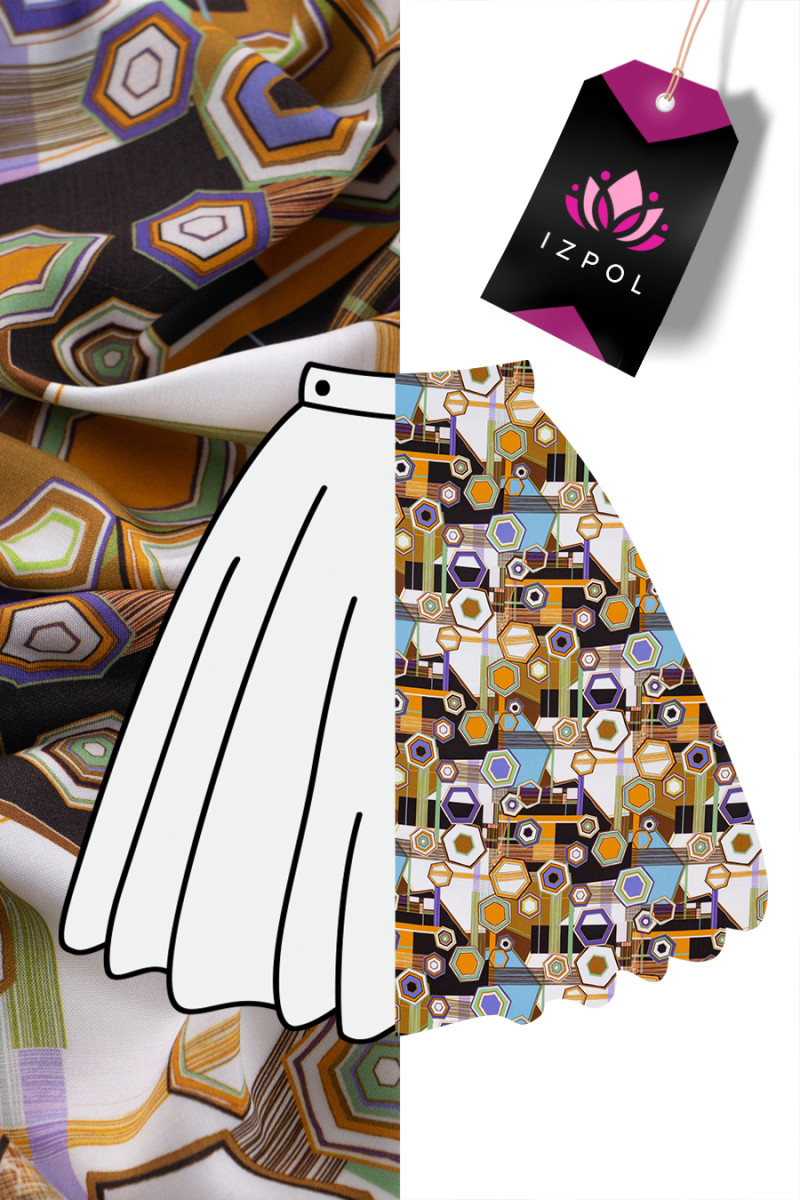 Olasz 100% viszkóz szövet krém színű, színes geometriai mintával. A viszkóz cellulózból nyert anyag, nagyon lélegző és puha, bőrbarát (nem allergén) és tökéletesen elnyeli a nedvességet. Nem rugalmas, átlátszatlan anyag - tökéletes nyári ruha, blúz vagy szoknya varrásához.
