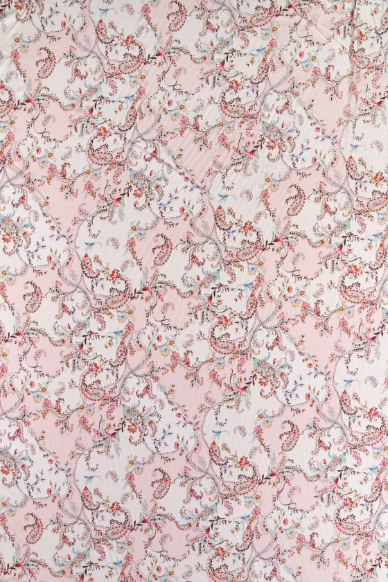 Olasz 100% viszkóz szövet világos rózsaszínben, színes paisley motívummal, kis virágokkal és gallyakkal. A viszkóz cellulózból nyert anyag, nagyon lélegző és puha, bőrbarát (nem allergén) és tökéletesen elnyeli a nedvességet.