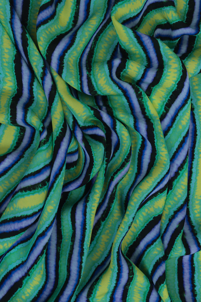 Olasz 100% viszkóz szövet, nagyon érdekes motívummal, függőleges mintákkal, amelyek 2 cm széles csíkokra hasonlítanak. Az egészet zöld, fekete, lila és sárga színben tartják. A szövet közepes vastagságú, sűrű szövésű. Ideális ajánlat azok számára, akik szeretik az eredeti mintákat és színeket.