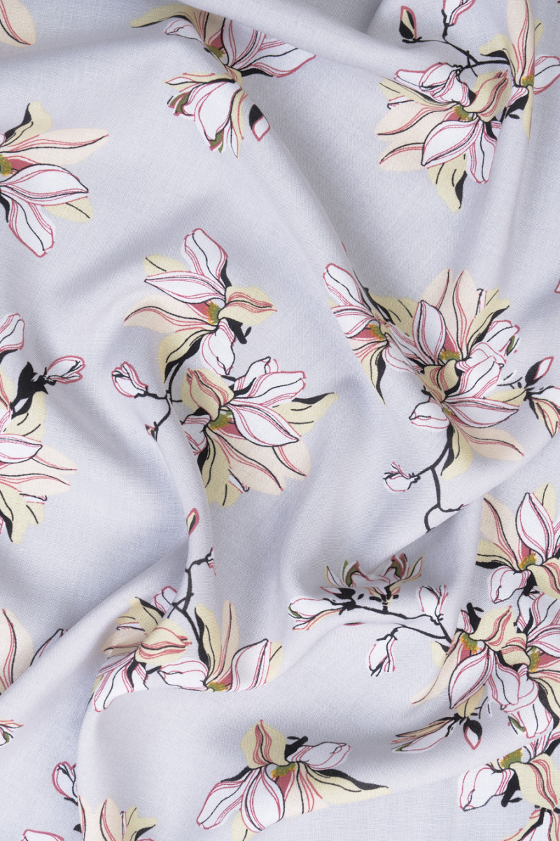 Olasz 100% viszkóz szövet szürke színben, sűrű virágmotívummal. A virágok mérete 10 cm és 15 cm között van, écru, bézs, fekete, bordó szegéllyel. A szövet vékony, nem rugalmas, sima szövésű. Nagyon finom javaslat nyári ruha, blúz vagy szoknya varrására.
