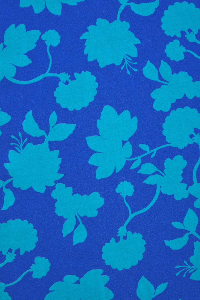 Olasz 100% viszkóz szövet búzavirágkék színben, sűrű türkizkék motívummal. A nyomtatás nagyon jellemző, és csak a virágok alakját mutatja be. A szövet nem rugalmas, puha és átlátszatlan, nagyon kellemes tapintású. Ez a faj tökéletes a forró nyári napokra.