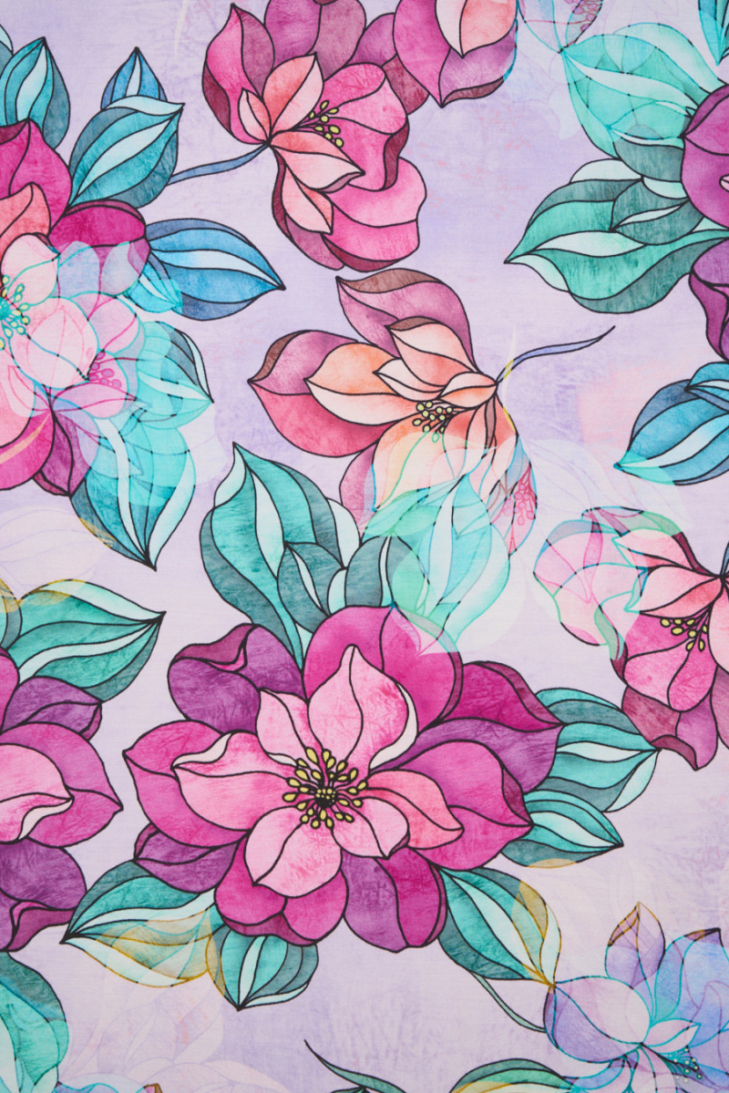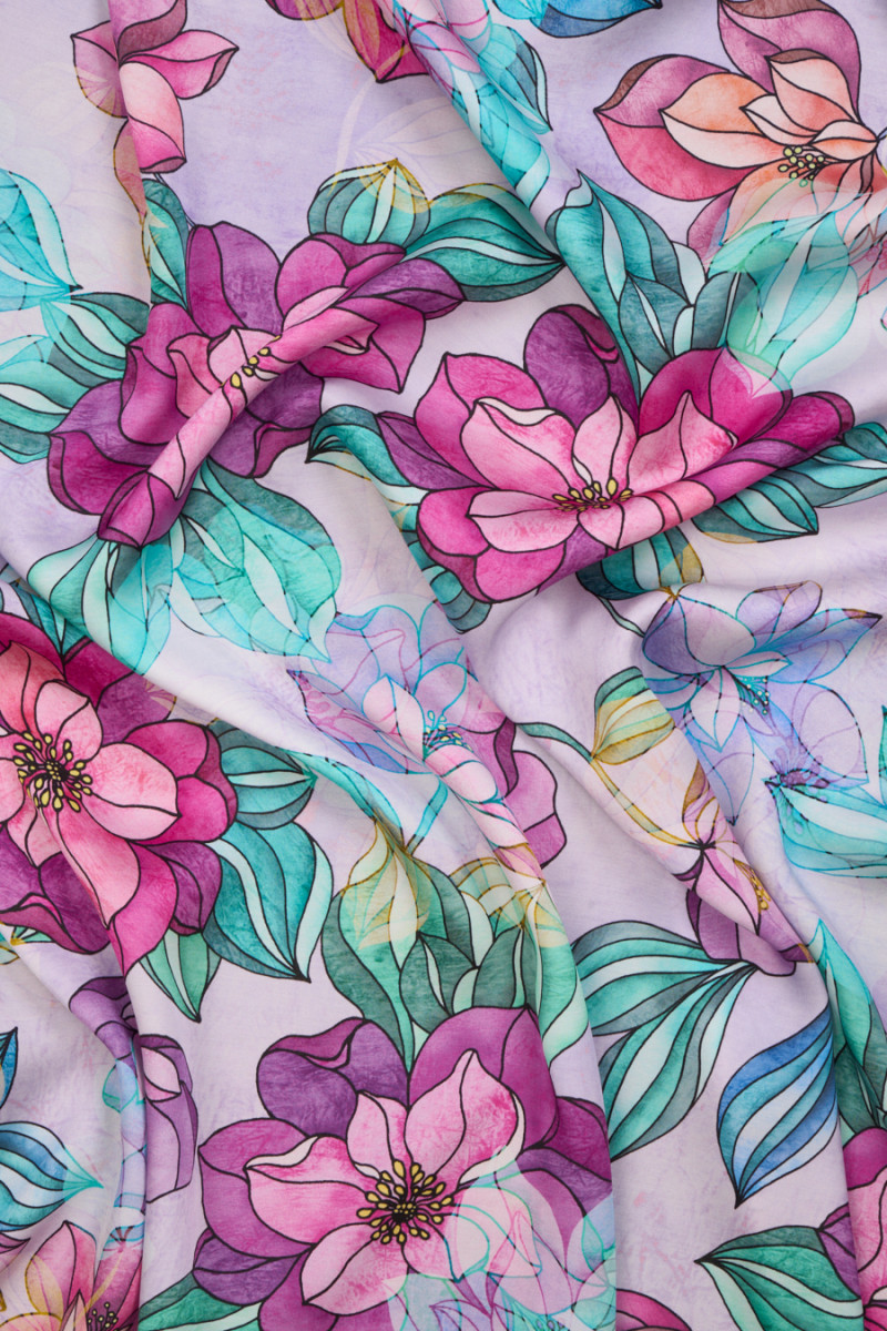 Olasz szövet 100% viszkóz nagy, rózsaszín virágokkal és világos zöld levelekkel, lila alapon. A szövet szatén, puha, áramló, könnyű és nagyon kellemes tapintású. Tökéletes ajánlat egyedi ruhákhoz, például ruhákhoz, szoknyákhoz, blúzokhoz és ingekhez.