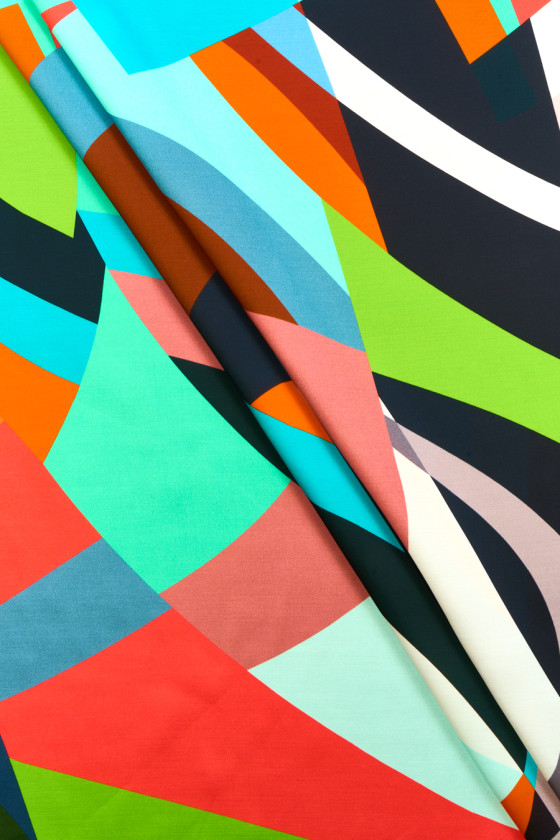 Olasz szövet 100% viszkóz színes geometriai motívumokkal. Eredeti minta energikus színekben, különböző méretű és formájú elemekből áll. A szövet szatén, puha, áramló, könnyű és nagyon kellemes tapintású. Érdekes ajánlat egyedi ruhákhoz, például ruhákhoz, szoknyákhoz, blúzokhoz és ingekhez.