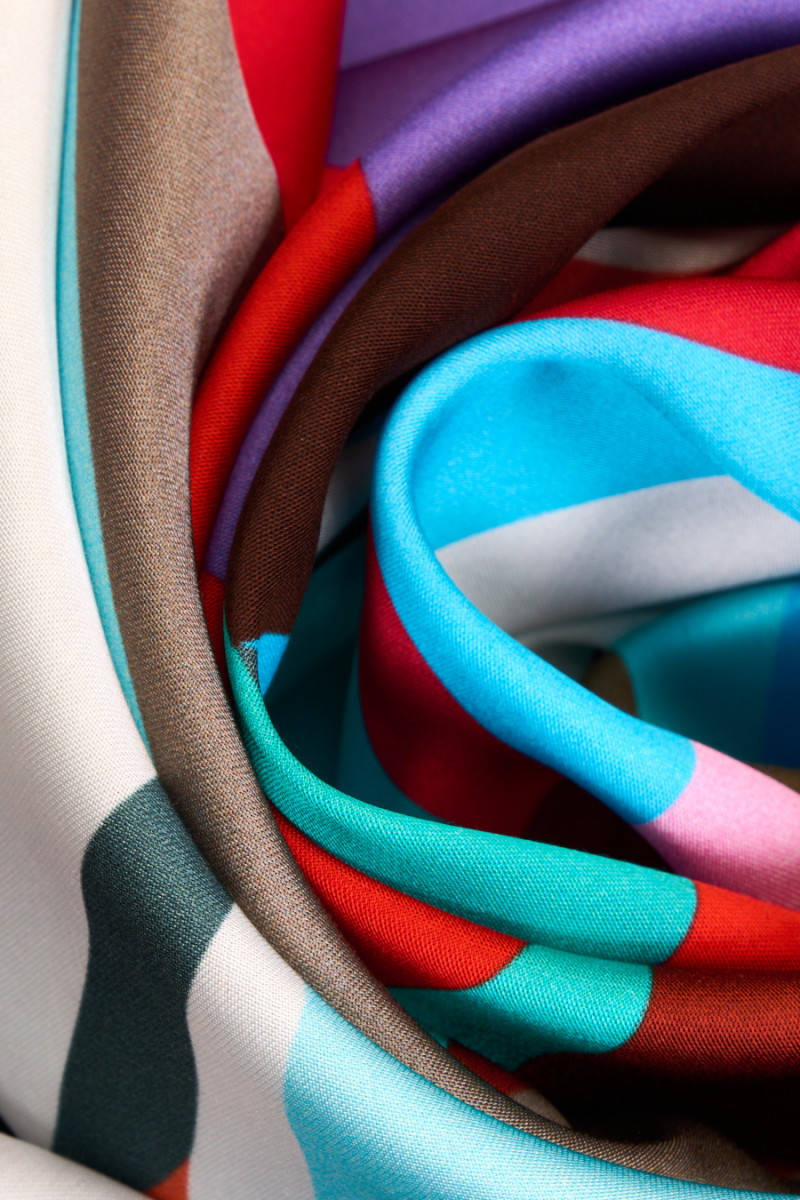 Olasz szövet 100% viszkóz színes geometriai motívumokkal. Eredeti minta energikus színekben, különböző méretű és formájú elemekből áll. A szövet szatén, puha, áramló, könnyű és nagyon kellemes tapintású. Érdekes ajánlat egyedi ruhákhoz, például ruhákhoz, szoknyákhoz, blúzokhoz és ingekhez.