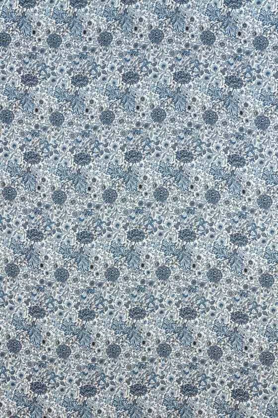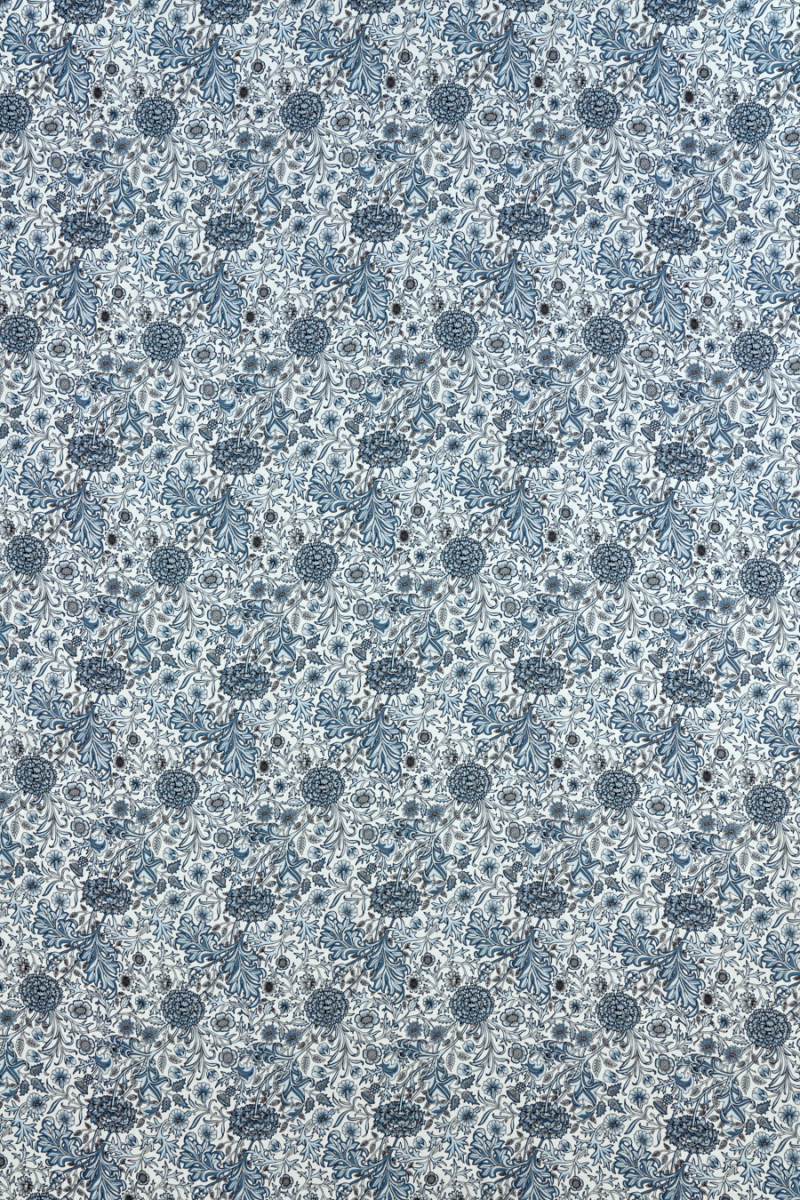 Olasz szövet viszkóz és len keverékéből, sűrű virágmotívummal, kékesszürke színben, krém alapon. A szövet könnyű, puha, nem rugalmas, átlátszatlan, és a szövésben vászonnak tűnik. Romantikus ajánlat tökéletes nyári ruhákhoz, tökéletes ingekhez, szoknyákhoz, ruhákhoz.
