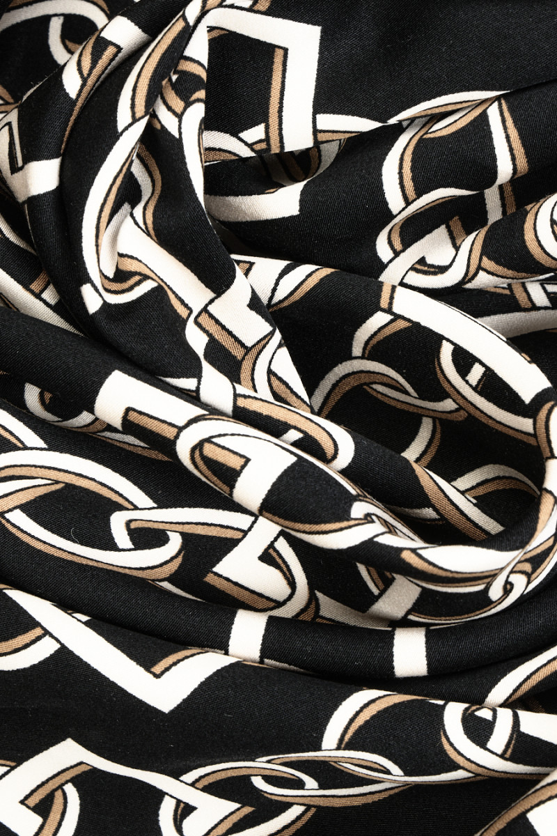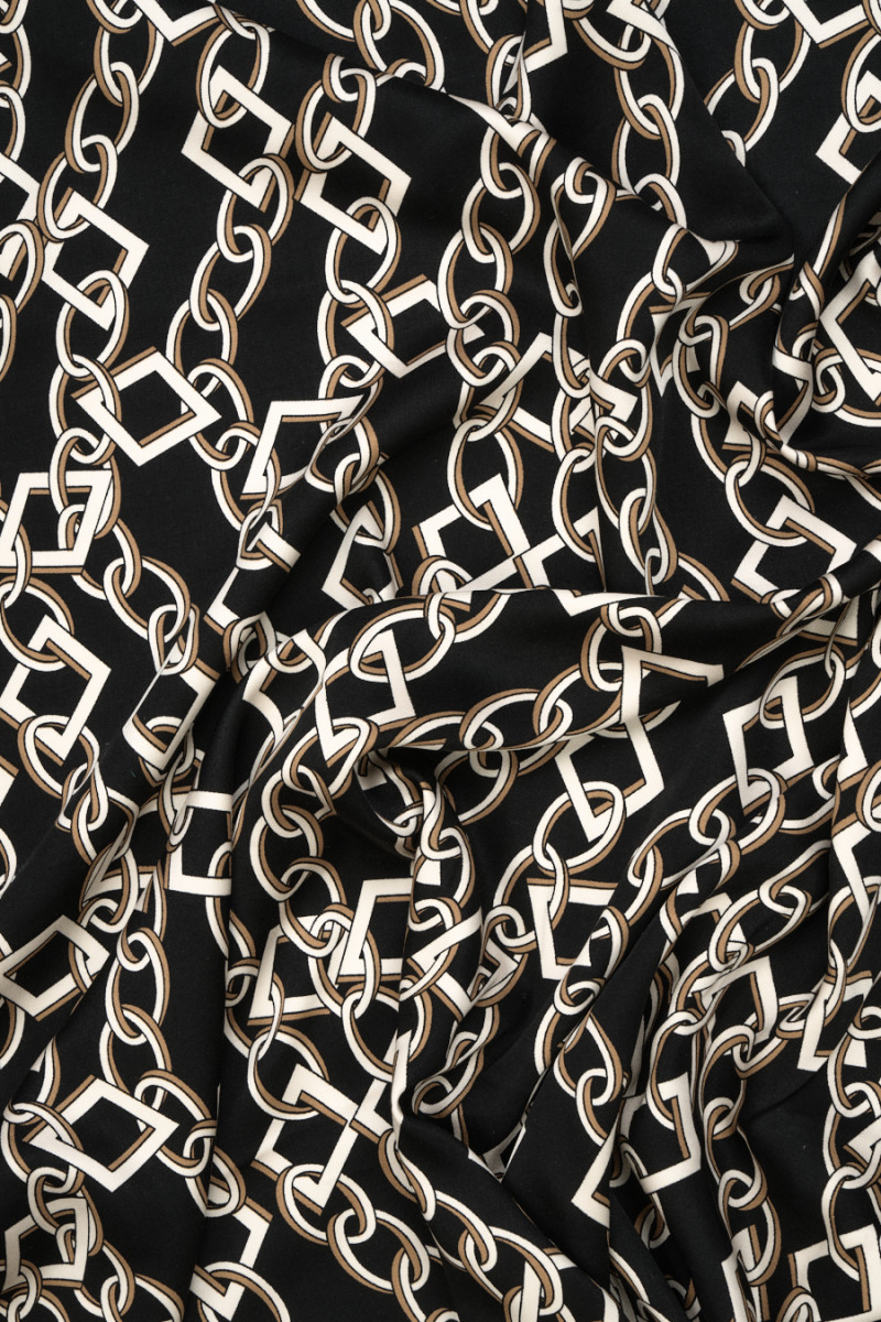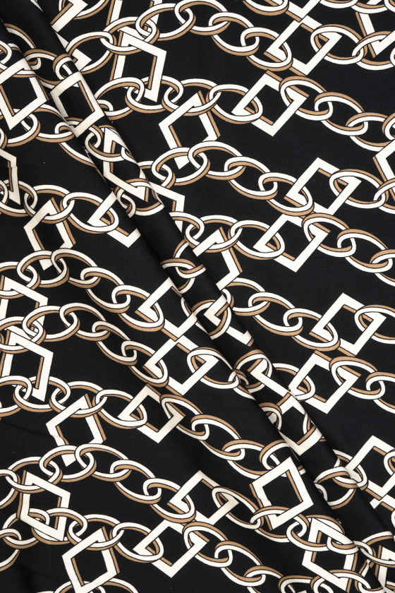 Olasz szövet 100% viszkóz, lánc motívummal, fekete alapon. Sűrű és szabályos minta krém és bézs színben, egy lánc körülbelül 2,5 cm széles. A szövet áramló, puha, kellemes tapintású, vékony, de átlátszatlan és rugalmatlan. Érdekes ajánlat azok számára, akik szeretik a karakteres szöveteket. Tökéletes tágas ruhák, szoknyák, valamint blúzok és ingek varrására.