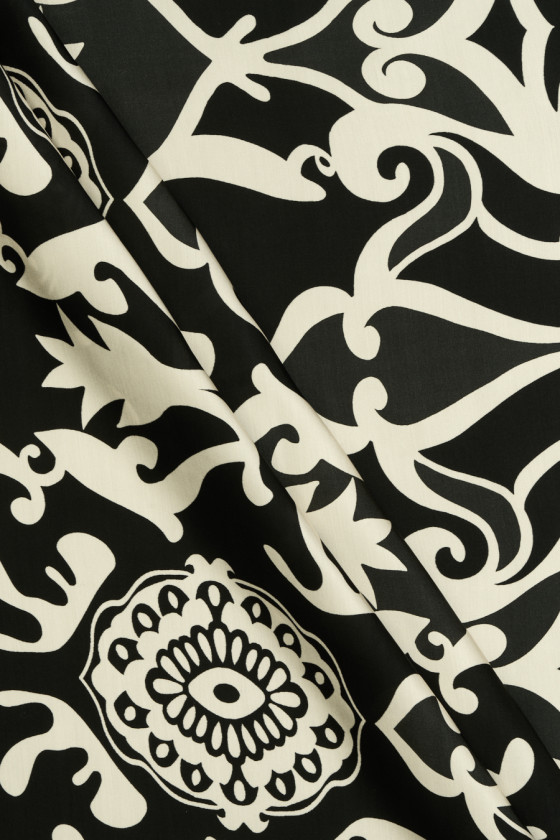 Olasz viszkóz szatén 95cm x 135 cm méretű kuponban. Sűrűn elhelyezett keleti minta világos bézs színű, fekete alapon, a kupon rozettákkal van ellátva. A szövet nem rugalmas, áramló, finom tapintású, puha és szépen illeszkedik. A szatén szövés nemes fényt ad neki. Fantasztikus ajánlat azok számára, akik egyedi és érdekes anyagokat keresnek ingekhez, szoknyákhoz, ruhákhoz vagy sálakhoz.