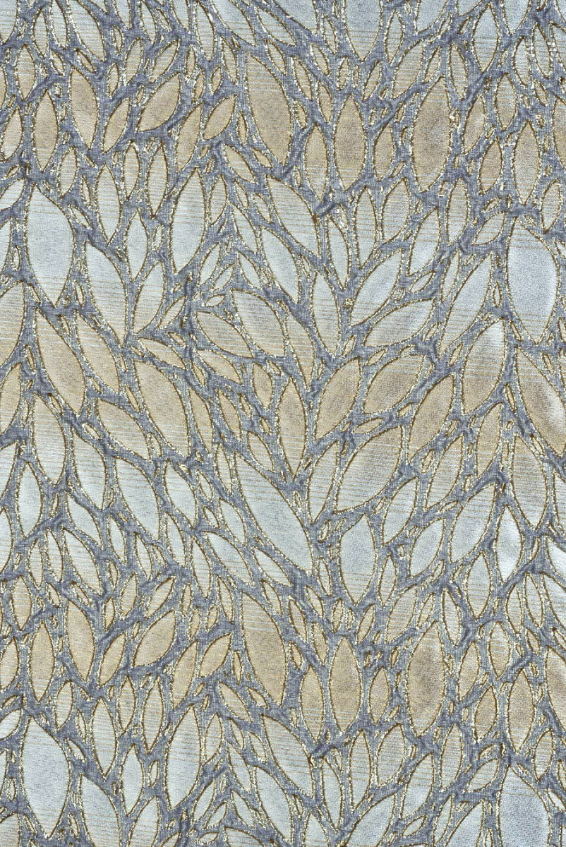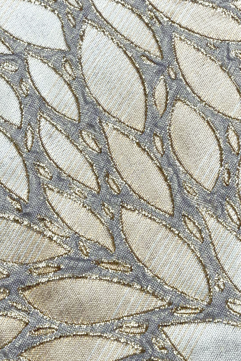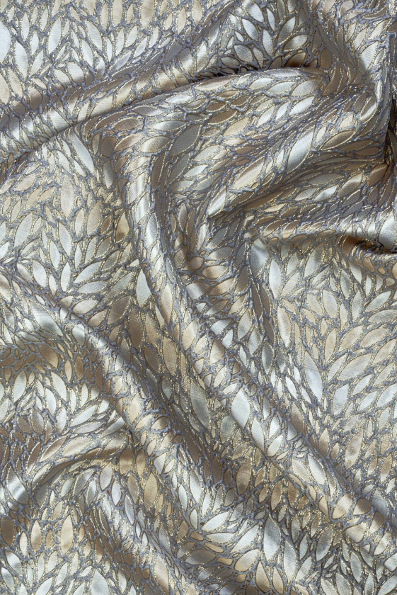 Polyesterová žakárová tkanina s motívom v tvare listu v svetlošedých okrajoch. Veľmi husto umiestnené motívy majú rôzne veľkosti, najmenší je 5 mm a najväčší 5 cm, sú vyplnené lesklou niťou v dvoch odtieňoch béžovej. Teplejšia a chladnejšia béžová sa tkajú striedavo každé 4 cm a vytvárajú pruhy, ktoré dodávajú zaujímavý efekt tieňovania. Sivé okraje sú naopak konvexné. Látka je ľahká, neelastická, strednej hrúbky a pomerne tuho sedí. Dá sa použiť na vytvorenie večerných outfitov, ako sú šaty, sukne, bundy.