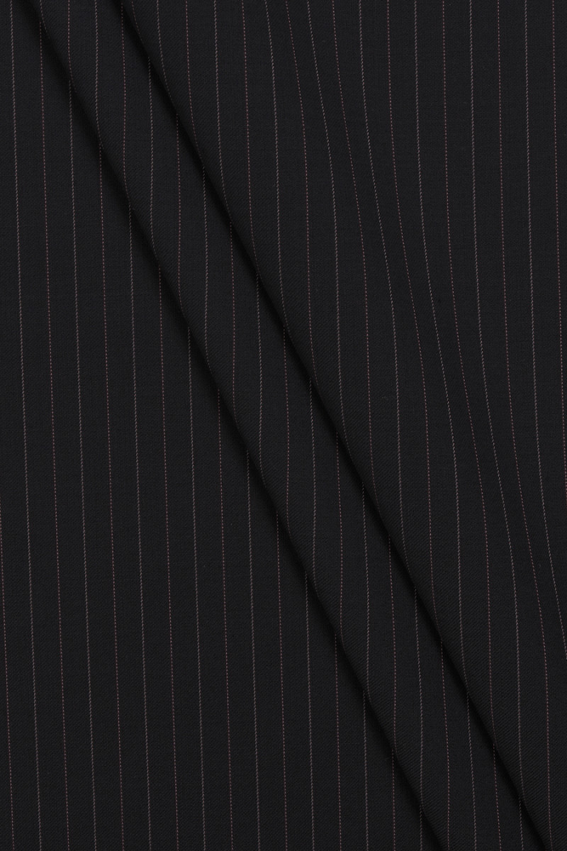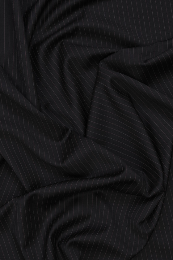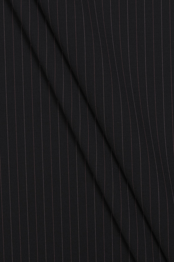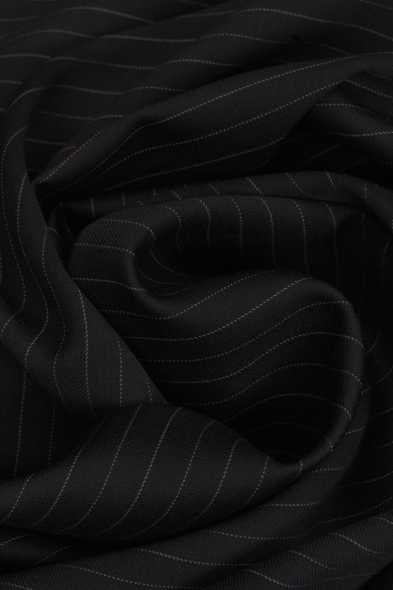 Італійська костюмна тканина, виткана з 100% темно-коричневої вовни з тонкими смужками в рожевих тонах. Смуги мають два відтінки рожевого, по черзі і розташовані на відстані через кожні 8 мм. Тканина м'яка, м'ясиста, нееластична. Відмінно підійде для пошиття костюма, костюма, брюк, спідниці, сукні.