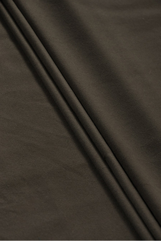 Itāļu, plānāks mētelis audums brūnā krāsā ar pilienu zaļas, austs no 100% dabīgas vilnas. Vilnas audumi ir ideāli piemēroti virsdrēbēm (mētelis, jaka, veste), jo tie ir silti un vienlaikus ļauj ādai elpot.