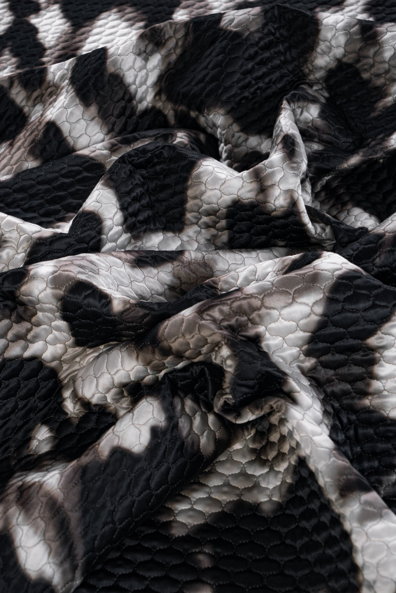 Pēdējais interesanta, divpusēja stepēta auduma kupons. No vienas puses, ar lielu, tumši brūnu plankumu rakstu uz balta fona, no otras puses, bez pelēka un akmens raksta. Kupons ir 180 cm garš un 150 cm plats. Tas ir lieliski piemērots īsai jakai vai vestei.
