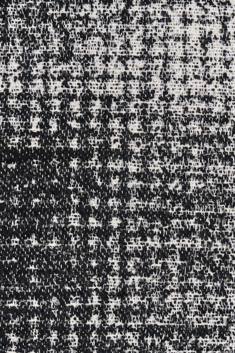 Itāļu vilna ar viskozes un poliamīda maisījumu melnā un krējuma krāsā. Ļoti mīksts, cēls audums ar izliektu austu, kas atgādina boucle. Interesants divu krāsu pavedienu austs rada lielu čeku motīvu. Tas ir lieliski piemērots rudens-ziemas mēteļa, jakas vai siltas vestes šūšanai. Dabisko šķiedru kombinācija ar sintētiskajām šķiedrām rada to, ka audums ir silts, bet tajā pašā laikā spēcīgs un izturīgs. Skaists un ļoti oriģināls audums cilvēkiem, kuriem patīk neparasti materiāli par labu cenu.
