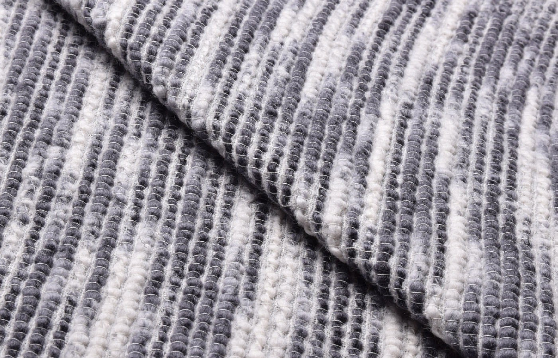 Itāļu mētelis, kas austs no dabīgas vilnas, pievienojot kašmiru pelēkā krēmkrāsā ar svītru motīvu ar izliektu tekstūru. Vilnas audumi ir ideāli piemēroti virsdrēbēm (mētelis, jaka, veste), jo tie ir silti un vienlaikus ļauj ādai elpot. Kašmira pievienošana padara to vēl labāk izolējošu, jo kašmirs ir siltāks par aitas vilnu.