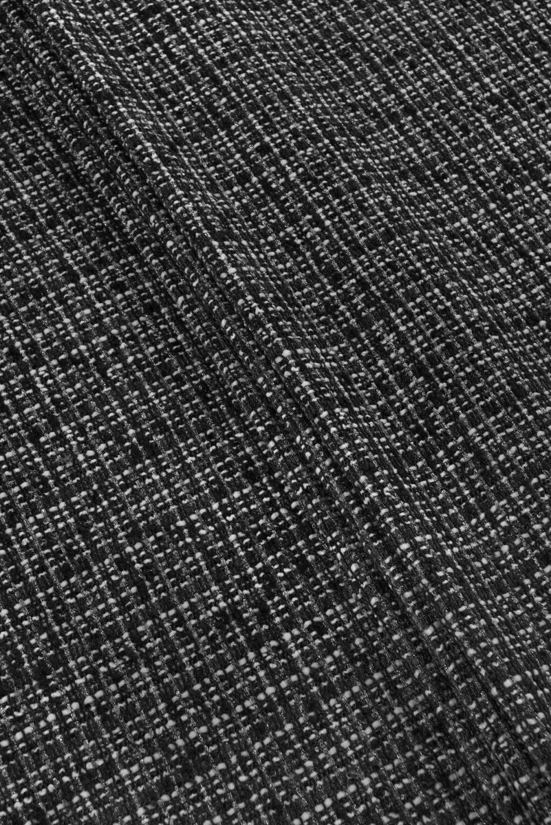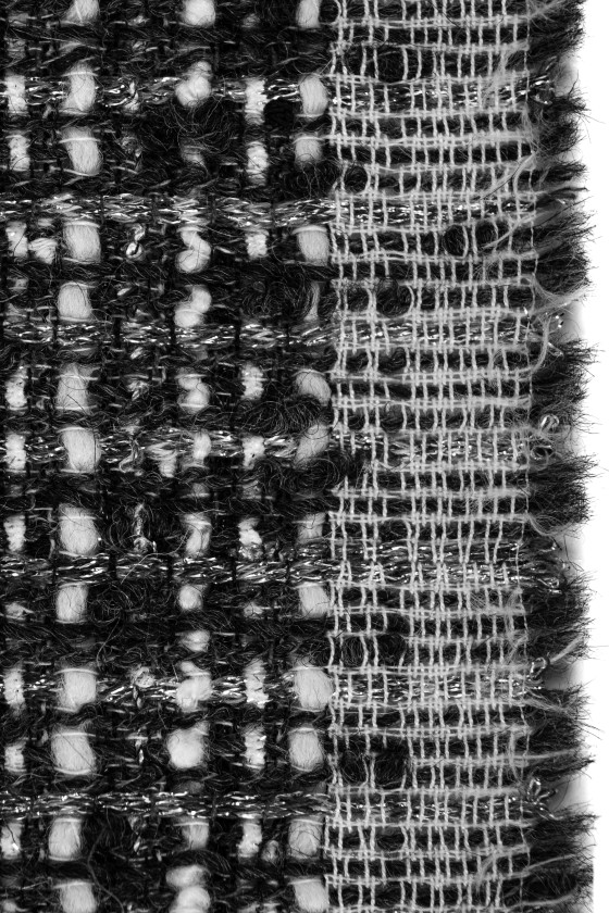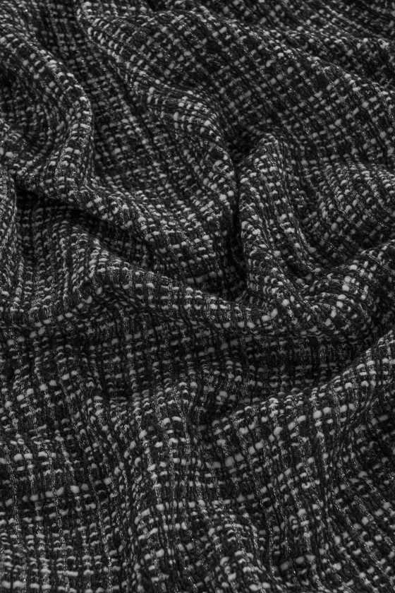 Itāļu chanel kostīma audums pelēkā un krēmkrāsā, kas dekorēts ar sudraba lurex diegu. Vidēji biezs audums ar nedaudz brīvāku austu.