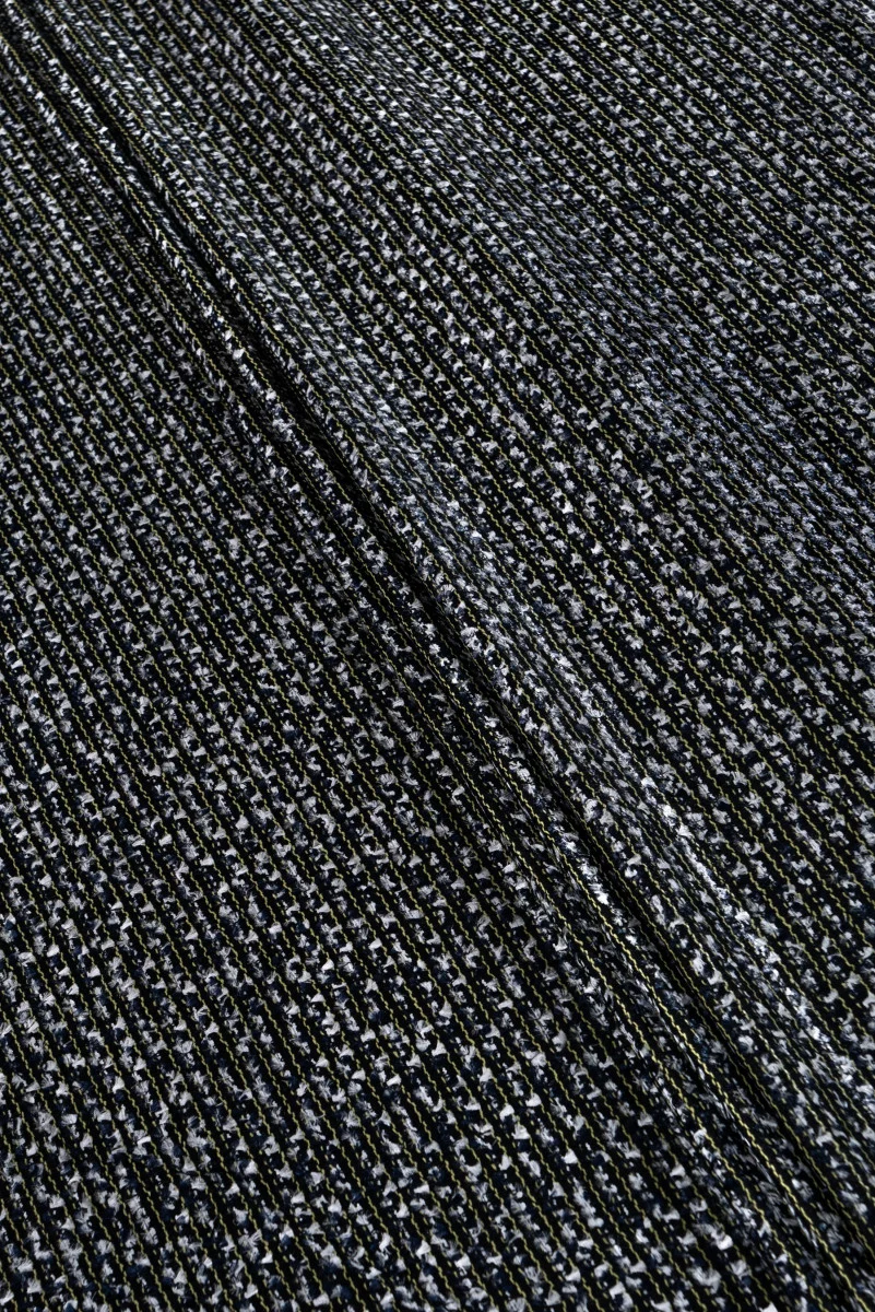 Itāļu Chanel kostīmu audums melnā krāsā ar baltu un tumši zilu, maziem pušķiem un laima diegu, kas sakārtots horizontālās svītrās. Chanel audums ir ļoti elegants, mīksts un mīksts audums, kas pazīstams ar savu oriģinālo austu.