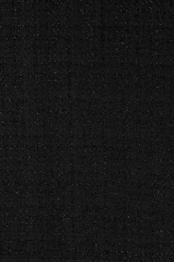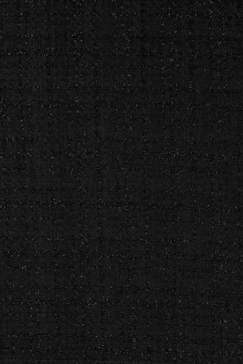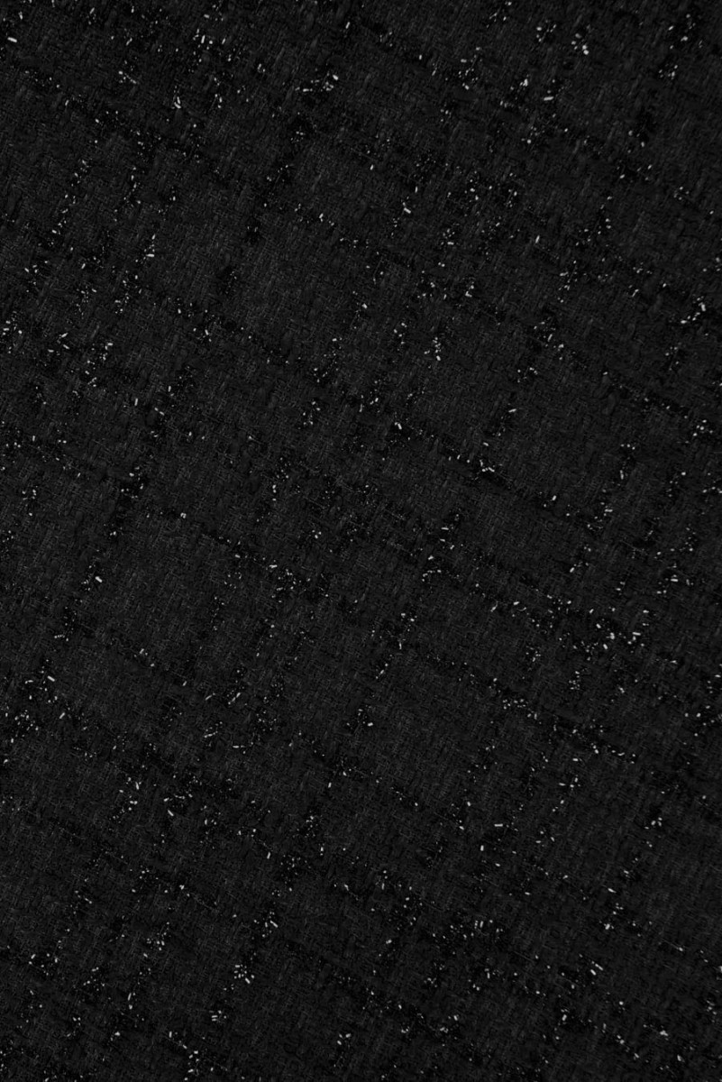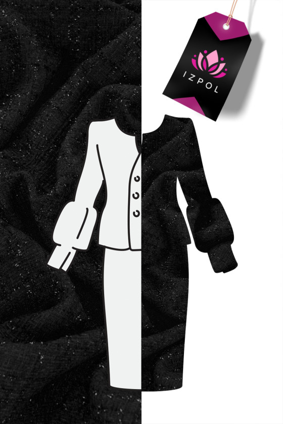 Itāļu chanel kostīma audums melnā krāsā ar tajā ieaustu lurex diegu. Ideāli piemērots tādiem komplektiem kā: jaka + svārki vai kleitas. To var izmantot arī, lai šūtu plānu, pārejas mēteli.