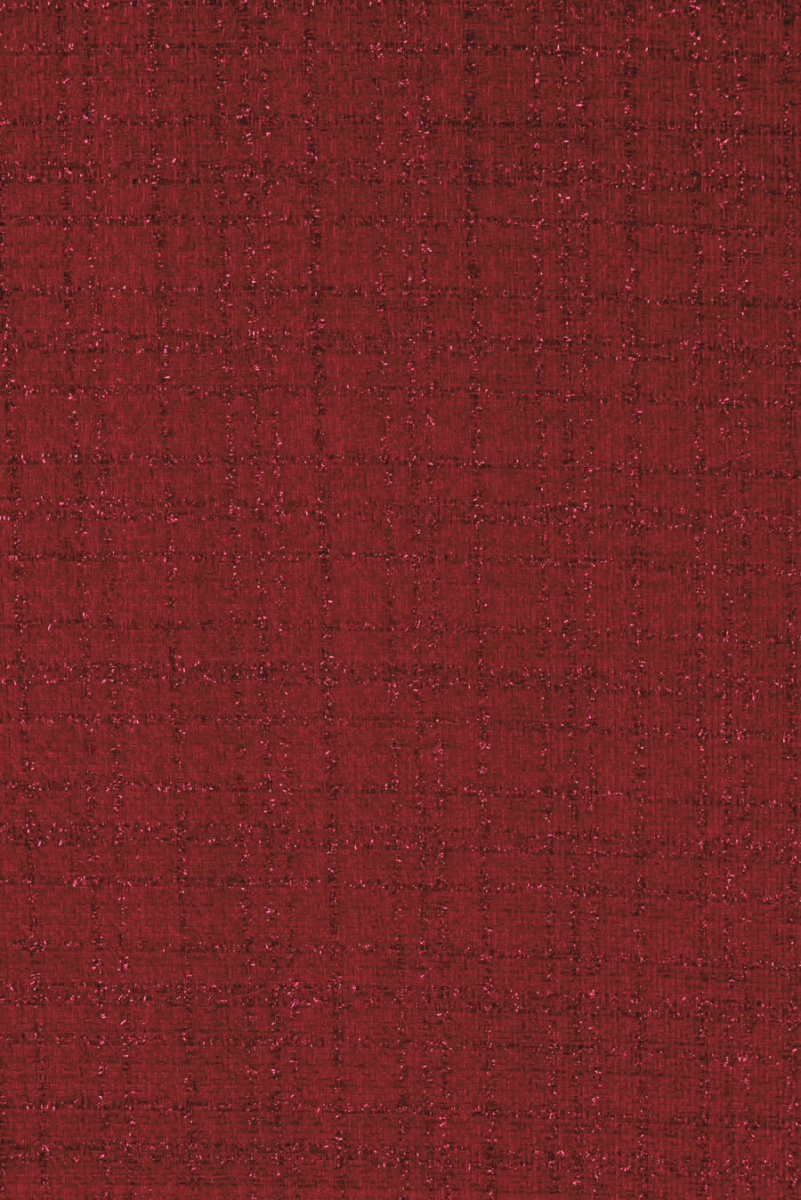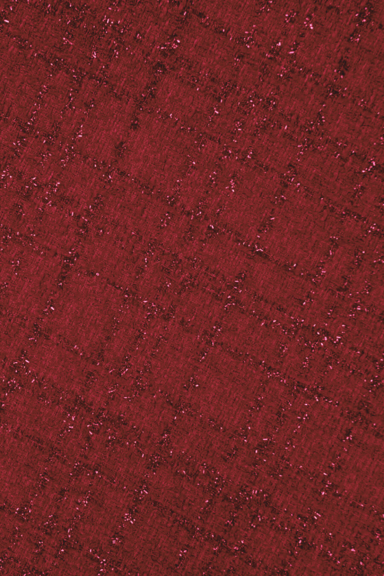 Itāļu chanel kostīmu audums tumši sarkanā bordo krāsā ar tajā ieaustu lurex pavedienu. Ideāli piemērots tādiem komplektiem kā: jaka + svārki vai kleitas. To var izmantot arī, lai šūtu plānu, pārejas mēteli.