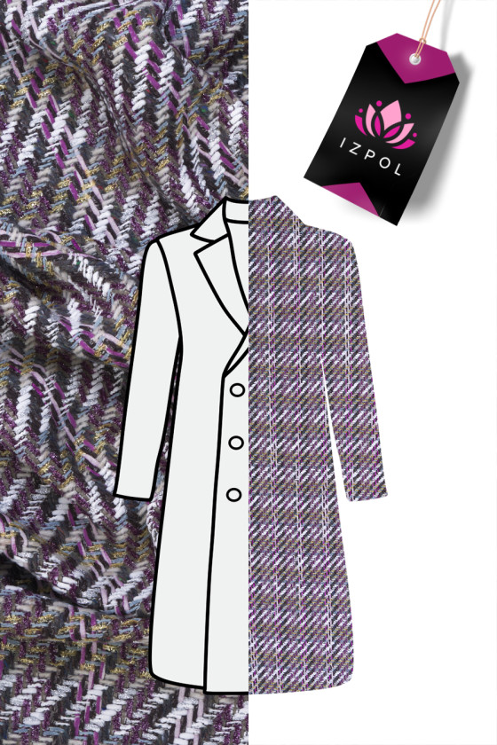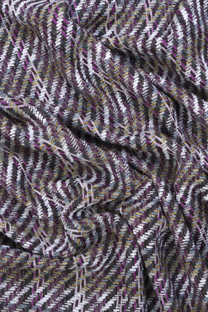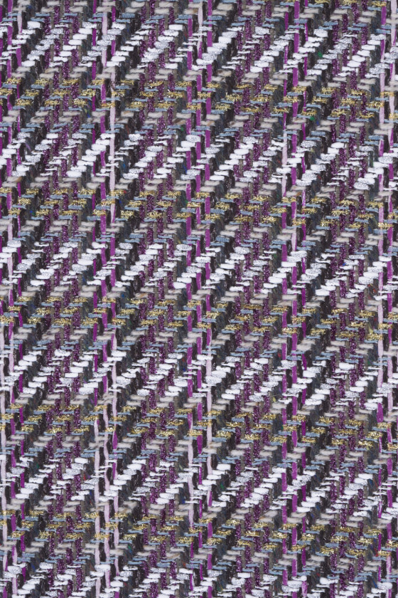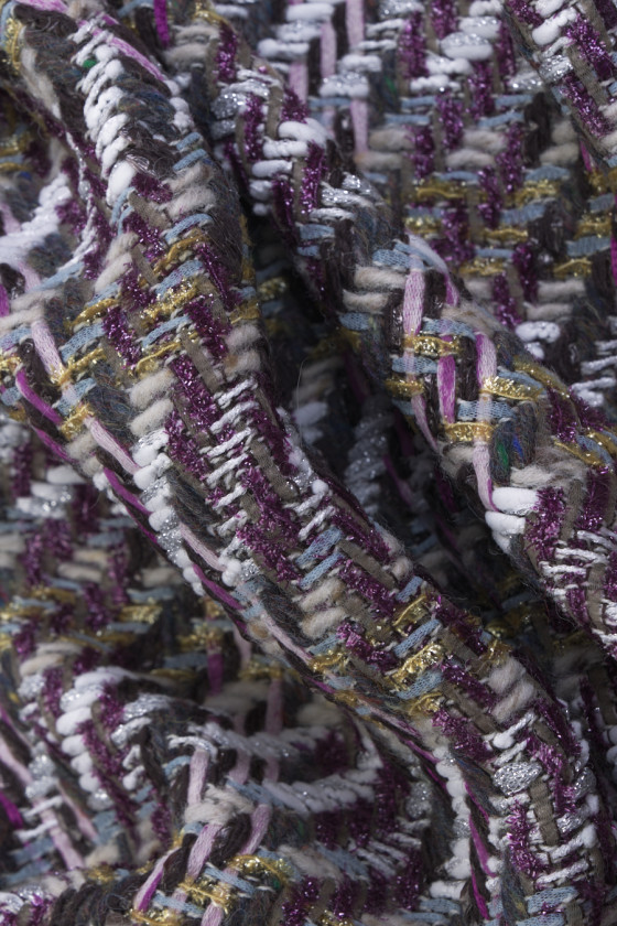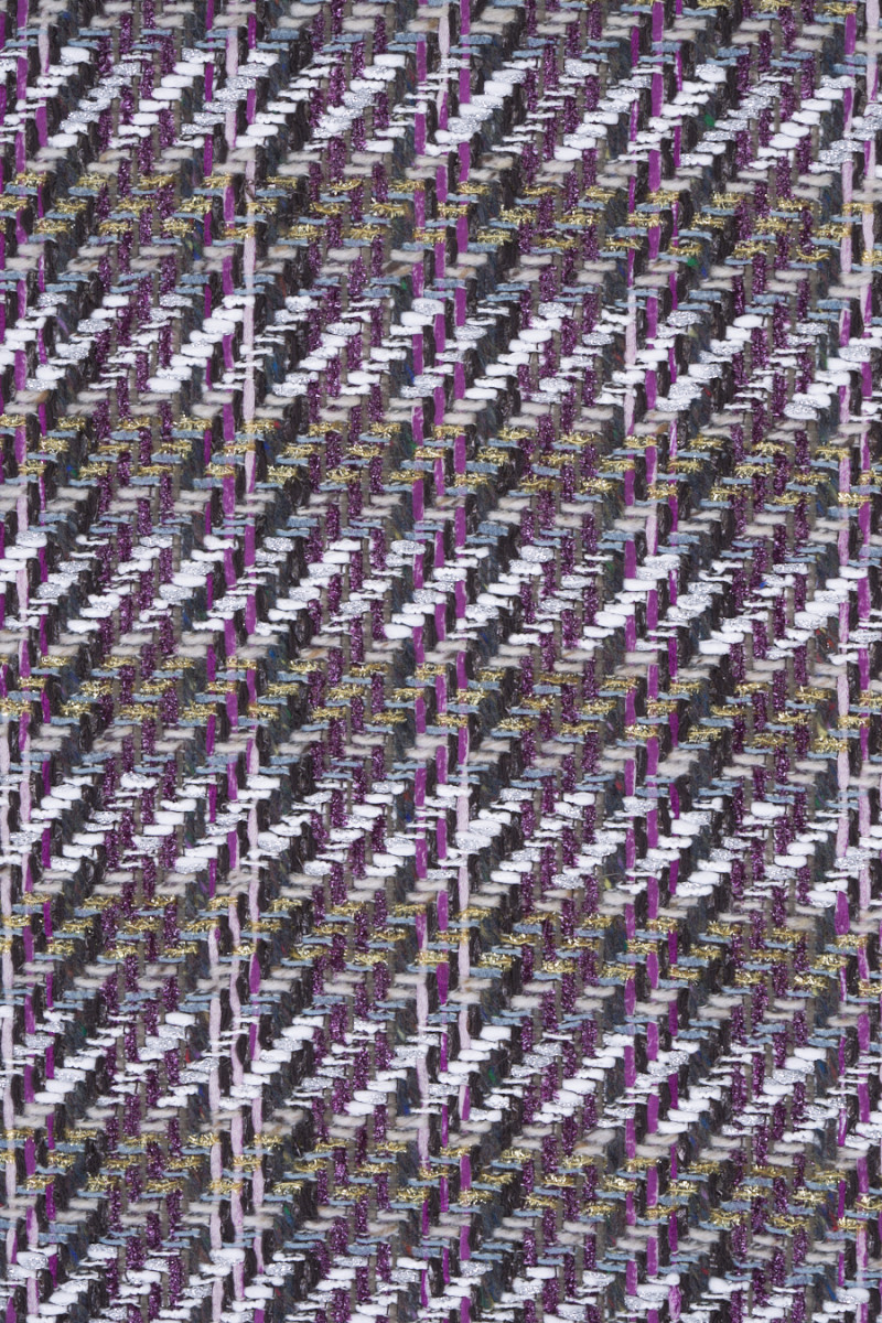 Itāļu chanel kostīmu audums pelēkā, écru un violetā krāsā. Audums ar nedaudz izliektu struktūru un brīvāku, iedomātāku austu, kas rada čeka motīvu. Audums ir smalki dekorēts ar spīdīgu pavedienu, kas tam piešķir eleganci. Audums ir izgatavots galvenokārt no dabīgām šķiedrām, tāpēc to ir ļoti ērti valkāt, un sintētiskā diega pievienošana padara to izturīgāku un neburzās. Fantastisks piedāvājums tvīda apģērbu faniem modernākajās krāsās.