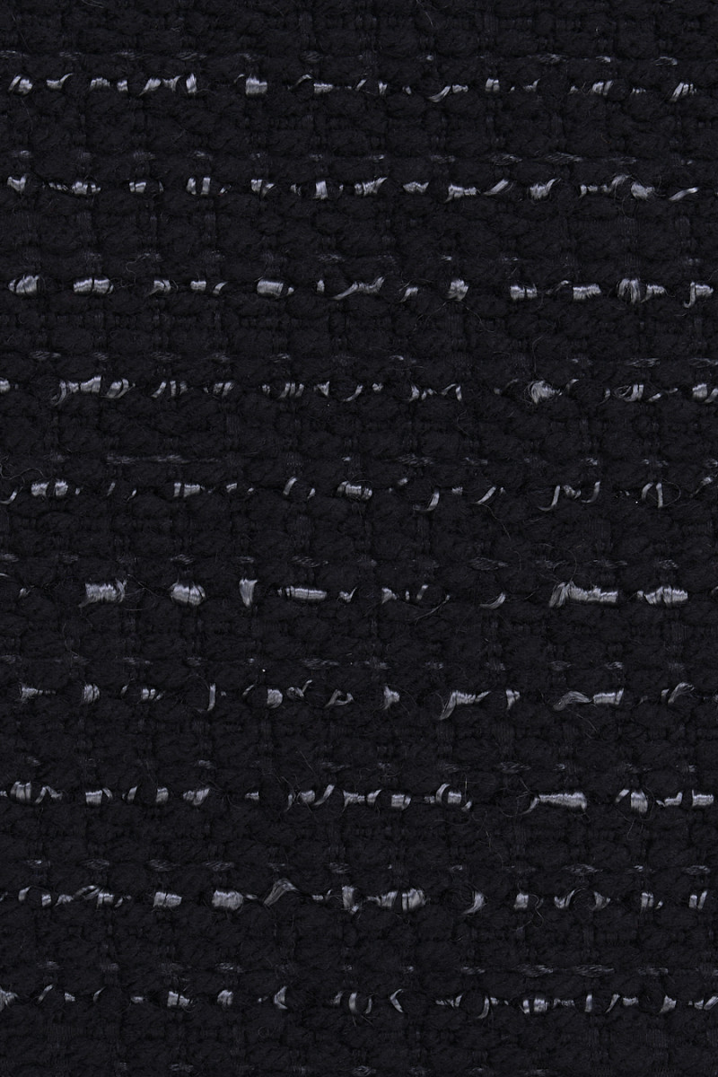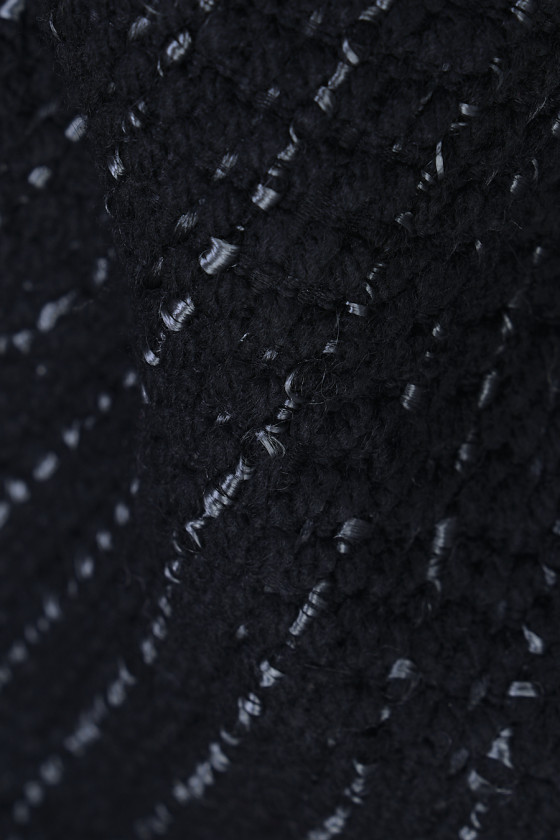 Itāļu rudens-ziemas kostīmu audums melnā krāsā, kas austs no dabīgas vilnas ar viskozes un akrila maisījumu. Audumam ir pelēka, horizontāla šuve, kas rada maigas 1,5 cm platas svītras. Dabisko šķiedru kombinācija ar sintētiskajām šķiedrām rada to, ka audums ir silts, bet tajā pašā laikā spēcīgs un izturīgs. Ideāls piedāvājums rudens kostīma, jakas vai kleitas šūšanai.