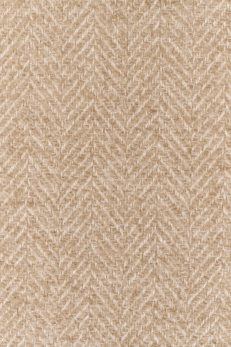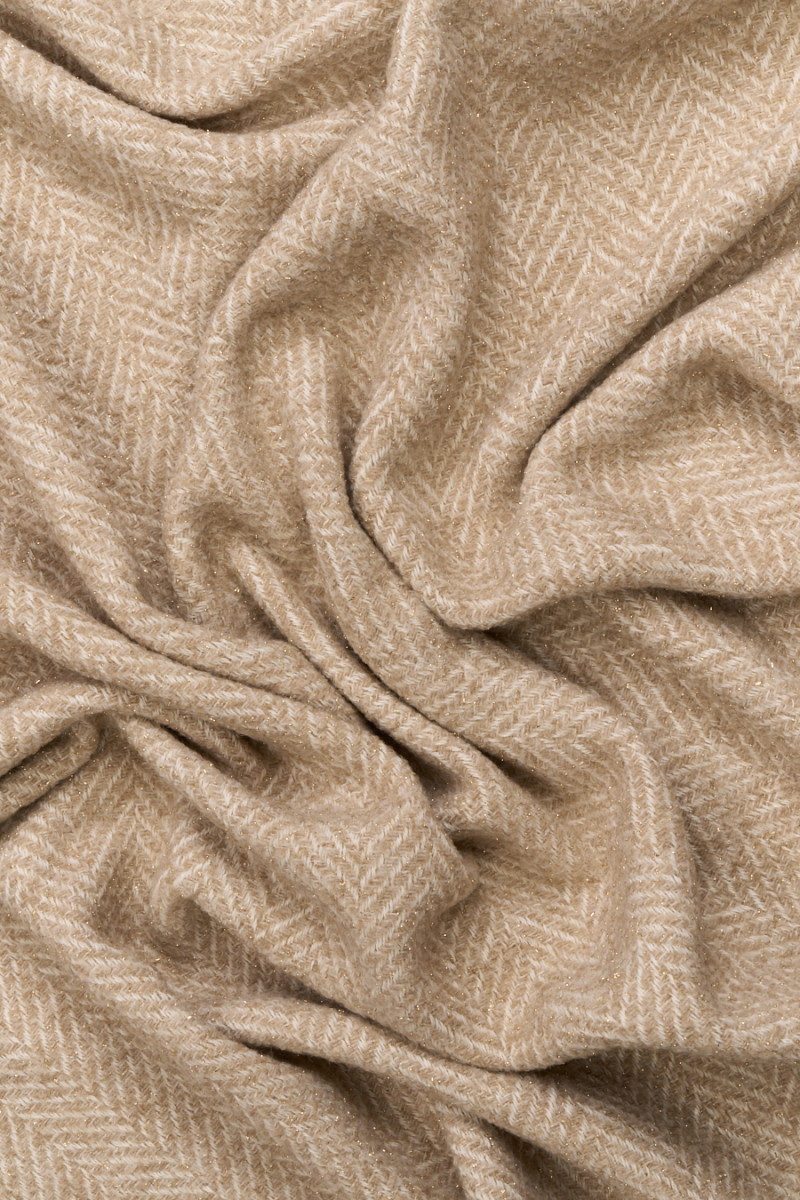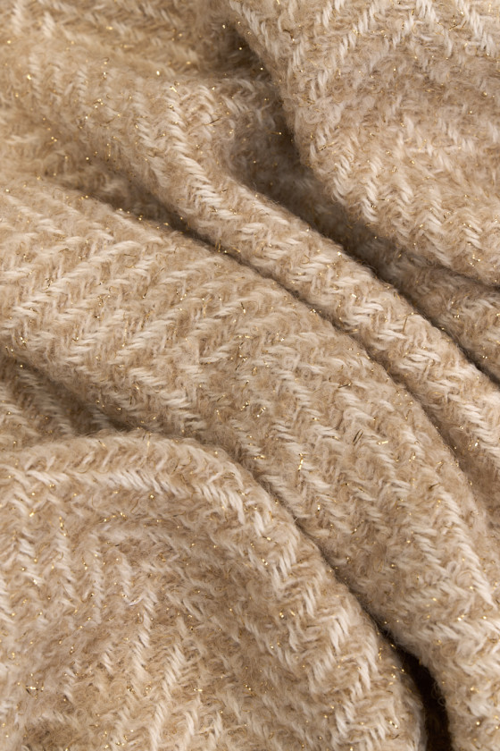 Itāļu chanel audums smilškrāsā un krēmā, kas dekorēts ar zelta lurex diegu, austs siļķes rakstā. Rudens un ziemas sugu audums, biezāks, mīksts, izgatavots galvenokārt no dabīgām šķiedrām, tāpēc to ir ļoti ērti valkāt, un vilnas pievienošana padara to siltāku. Priekšlikums cilvēkiem, kuriem patīk klasisks, mūžīgs dizains, tas būs lieliski piemērots plānas mēteļa, jakas vai jakas šūšanai