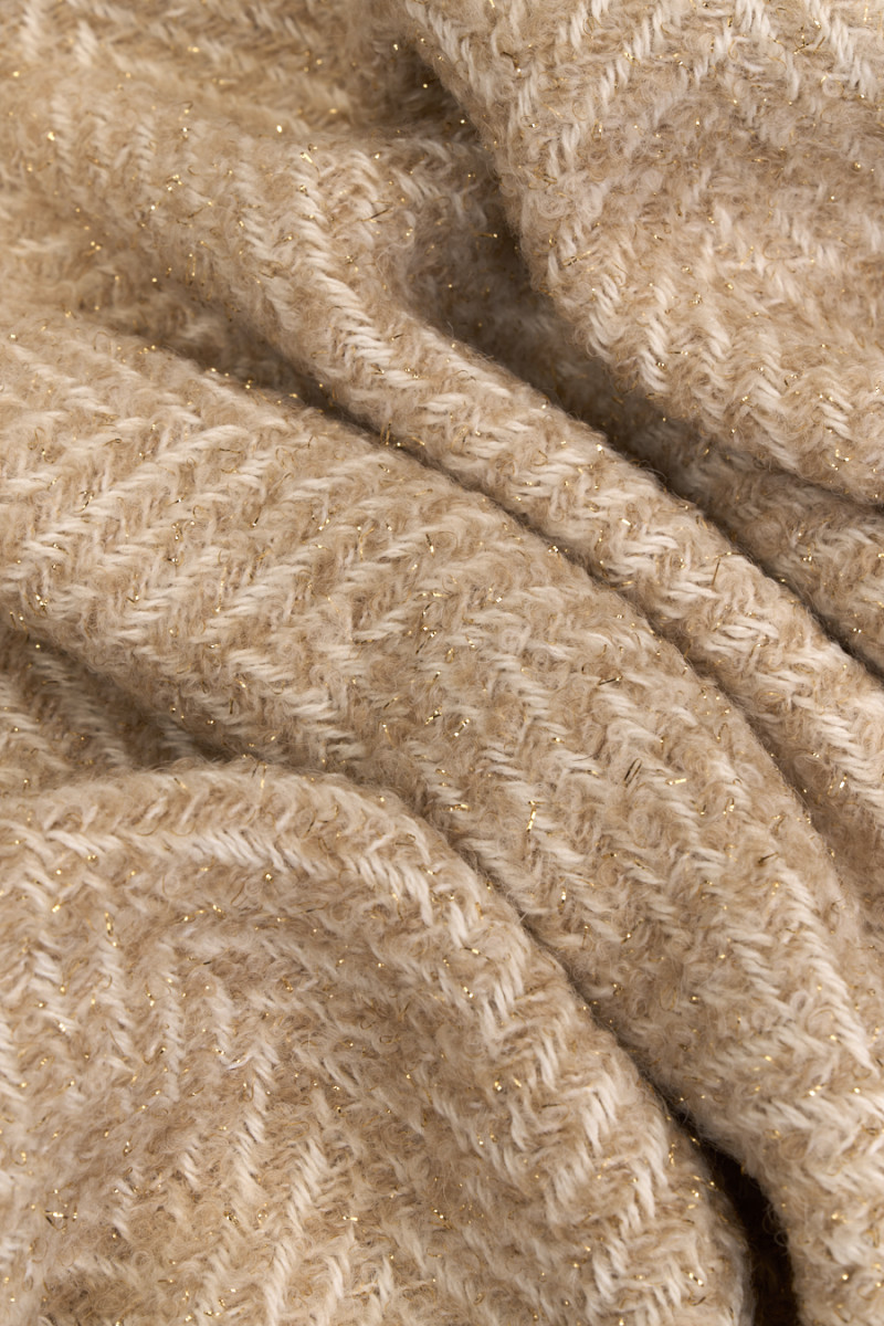 Itāļu chanel audums smilškrāsā un krēmā, kas dekorēts ar zelta lurex diegu, austs siļķes rakstā. Rudens un ziemas sugu audums, biezāks, mīksts, izgatavots galvenokārt no dabīgām šķiedrām, tāpēc to ir ļoti ērti valkāt, un vilnas pievienošana padara to siltāku. Priekšlikums cilvēkiem, kuriem patīk klasisks, mūžīgs dizains, būs lieliski piemērots plānas mēteļa, jakas vai jakas šūšanai.