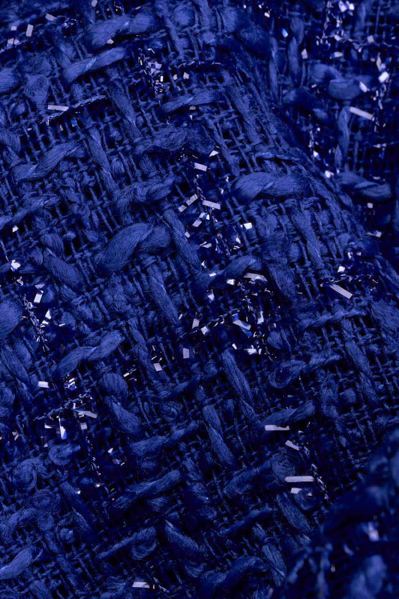 Itāļu chanel kostīmu audums rudzupuķu zilā krāsā ar tajā ieaustu lurex pavedienu. Ideāli piemērots tādiem komplektiem kā: jaka + svārki vai kleitas. To var izmantot arī, lai šūtu plānu, pārejas mēteli.