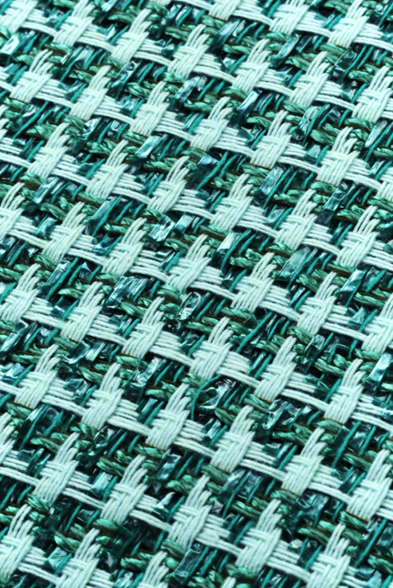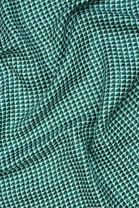 Itāļu chanel kostīmu audums zaļos toņos. Brīvi savstarpēji saistīti pavedieni rada nelielu čeku, regulāri austu rafiju, kas nedaudz spīd, piešķir unikālu izskatu visumam. Audums ir neelastīgs, viegls, mīksts drapējums, tam ir vaļīgs pinums, tāpēc iesakām oderi. Materiāls nāk no pazīstama modes dizainera kolekcijas. To var izmantot, lai uzburtu jakas, kleitas, svārkus vai šortus.