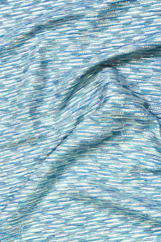 Itāļu chanel kostīmu audums, kas izgatavots ļoti interesantā pinumā, kur zilā un krēmkrāsa pavedieni rada smalkus viļņus, un atstarpes starp tām ir piepildītas ar sudraba, spīdīgu pavedienu. Audums ir neelastīgs, vidēja biezuma un nedaudz stingri drapē. Pateicoties augstajam kokvilnas saturam, materiāls ir patīkami satvērams, kas nozīmē arī valkāšanas komfortu. Lielisks piedāvājums cilvēkiem, kas meklē interesantu dizainu audumos. To var izmantot kostīmu, jaku, svārku vai kleitu šūšanai.