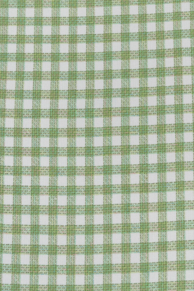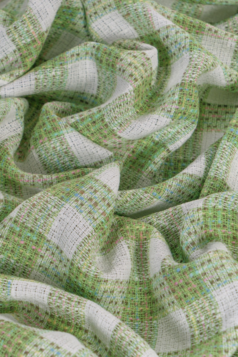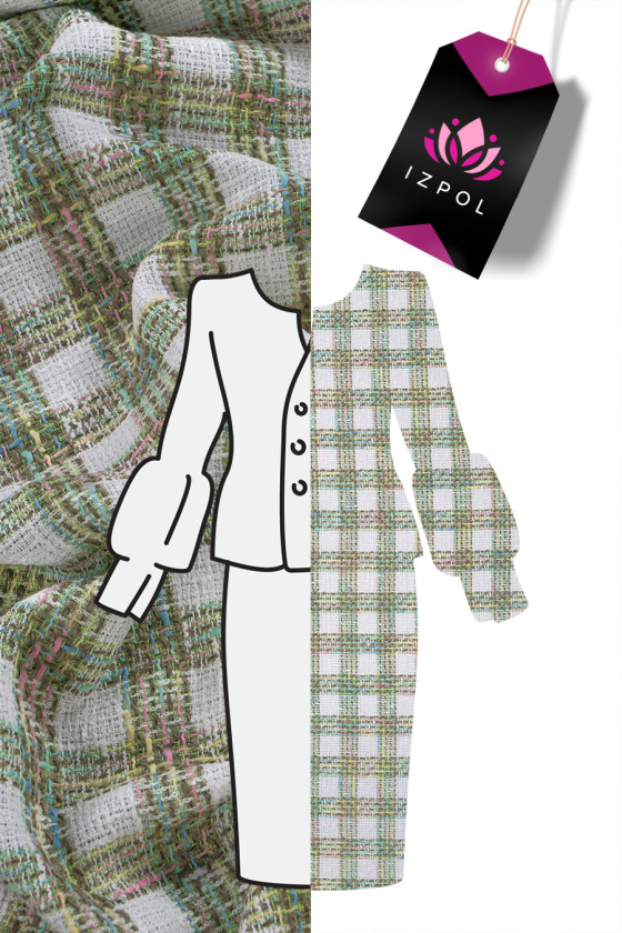 Rūtains chanel kostīmu audums baltā un gaiši zaļā krāsā ar rozā un zilu akcentu, kas paredzēts plāniem svārkiem vai kleitām. Materiāls ir brīvi austs no 100% viskozes, tāpēc tas ir elpojošs un elpojošs.