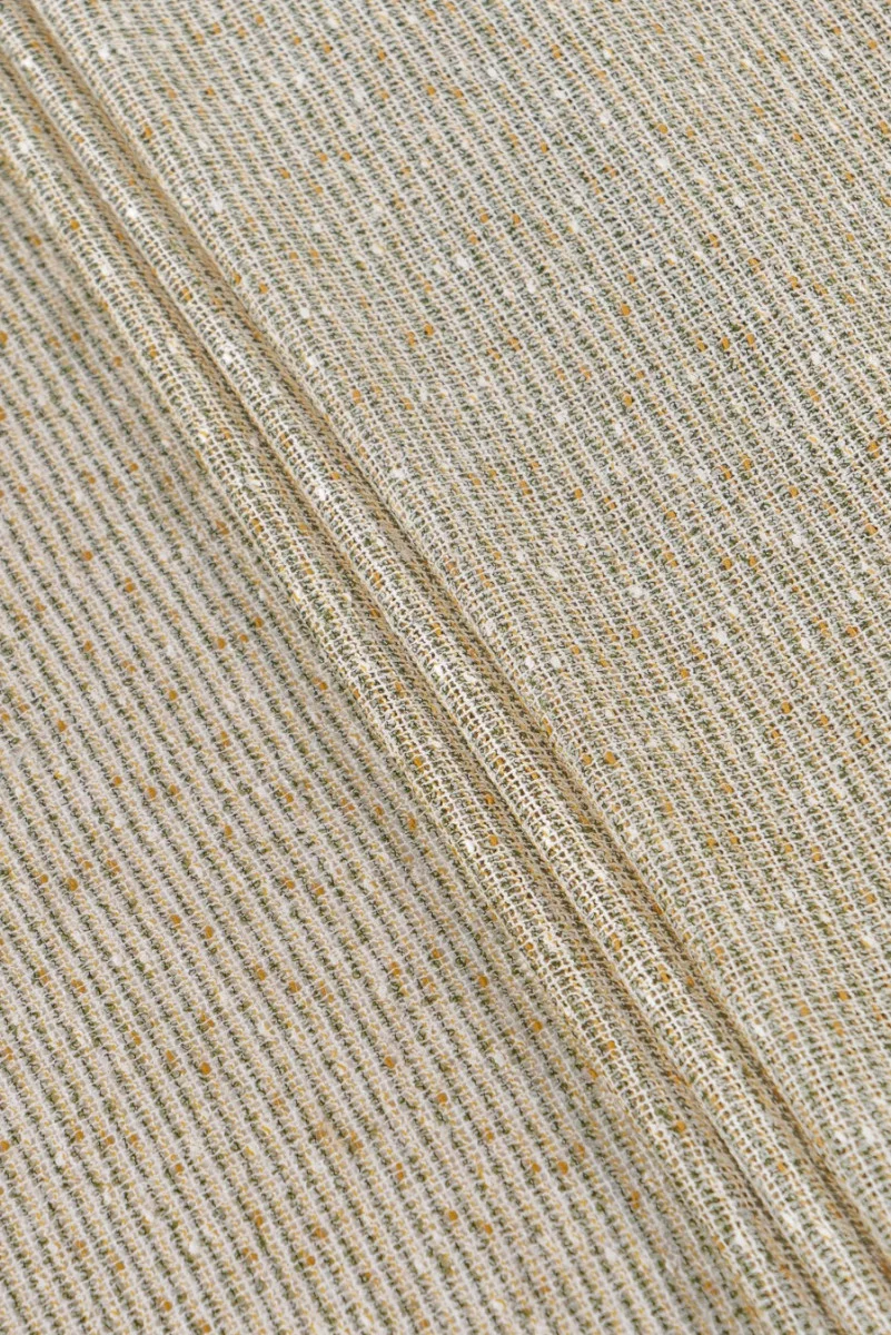 Kleitas audums ar brīvu austu kā tīkls, kas paredzēts pavasara kleitām, smilškrāsas melange ar olīvu un apelsīnu.