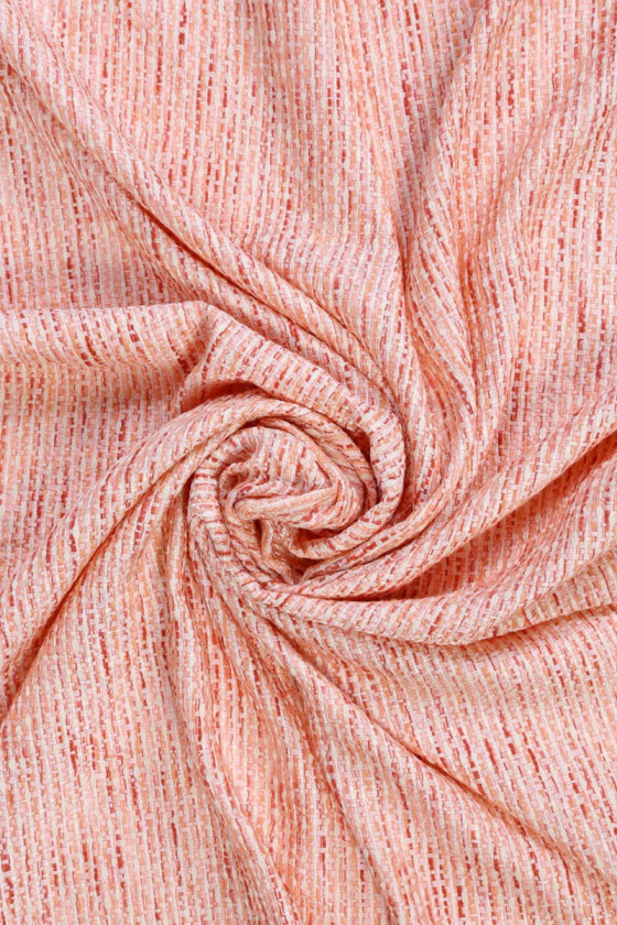 Skaists klasisks chanel kostīmu audums siltās krāsās - oranžā, ecru un sarkanā krāsā. Ideāli piemērots pavasara komplektiem: jaka un svārki. To var izmantot arī uz plāniem mēteļiem vai kleitām.