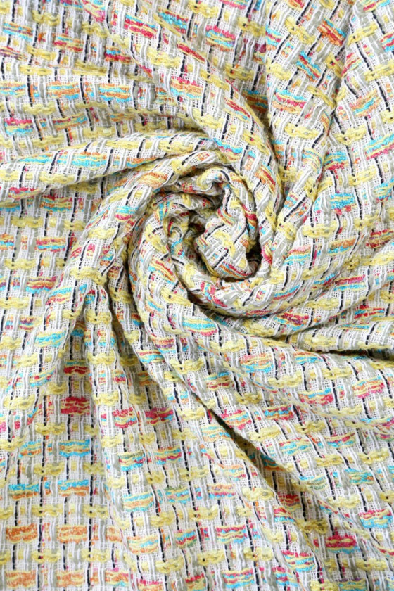 Skaists, klasisks chanel kostīmu audums pavasara-vasaras siltās krāsās. Ideāli piemērots tādiem komplektiem kā: jaka + svārki. To var izmantot arī kleitas šūšanai. Dabiskie pavedieni, piemēram, kokvilna un viskoze, nodrošina komfortu. Tas prasa izmantot oderi, ko var izvēlēties mūsu veikalā.