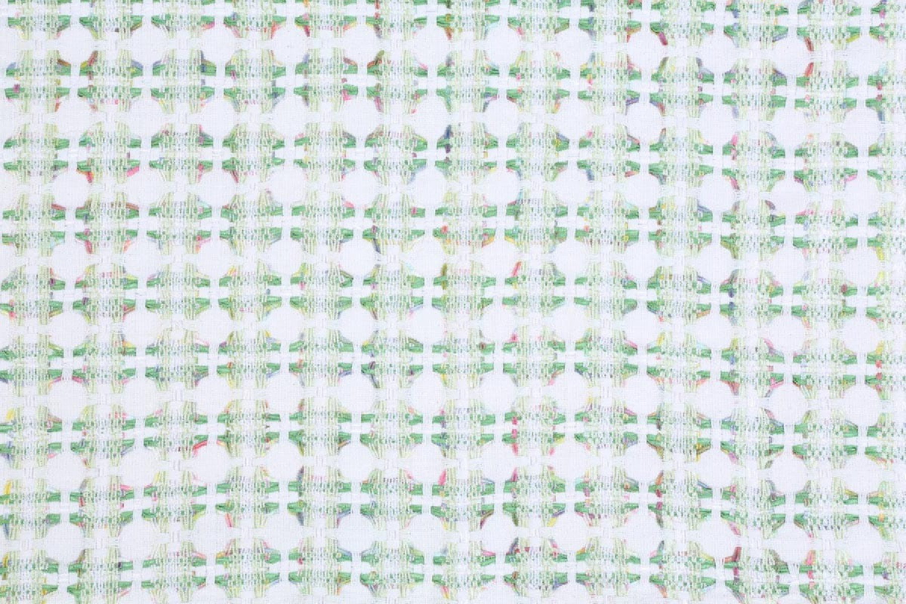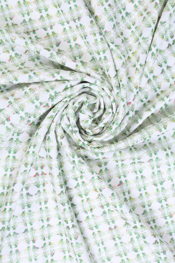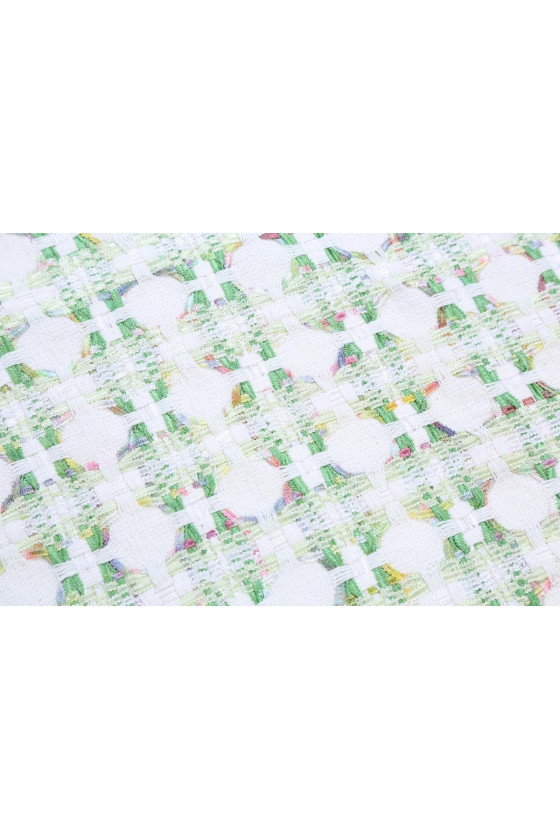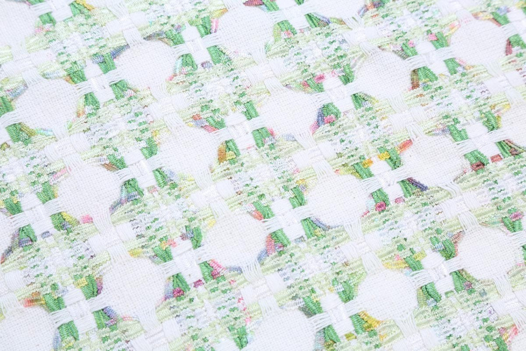 Chanel kostīmu audums pasteļzaļā, rozā, dzeltenā un ecru krāsā. Ideāli piemērots tādiem komplektiem kā: jaka + svārki vai kleitas. Dabiskie pavedieni, piemēram, vilna un kokvilna, nodrošina komfortu. Tas prasa izmantot oderi, ko var izvēlēties mūsu veikalā.