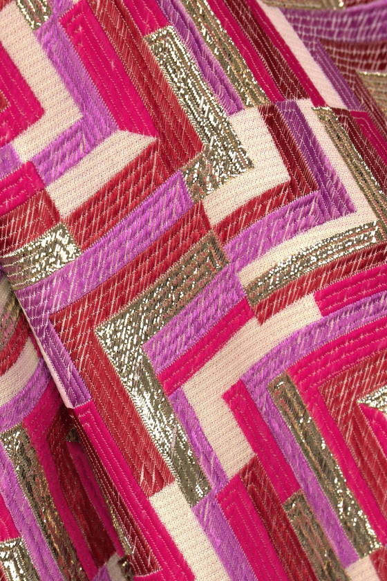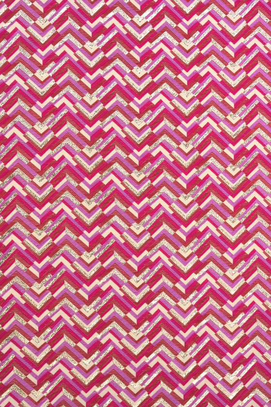 Itāļu žakarda kostīmu audums ar krāsainu zigzagu motīvu. Audums tiek turēts rozā, violetā un bēšā krāsā, un tas ir papildus dekorēts ar zelta lurex diegu, kas piešķir tai eleganci. Materiālam ir nedaudz izliekta struktūra, tas ir mīksts, vidēji biezs, necaurspīdīgs. Skaists piedāvājums kleitas, svārku un žaketes šūšanai īpašiem gadījumiem.