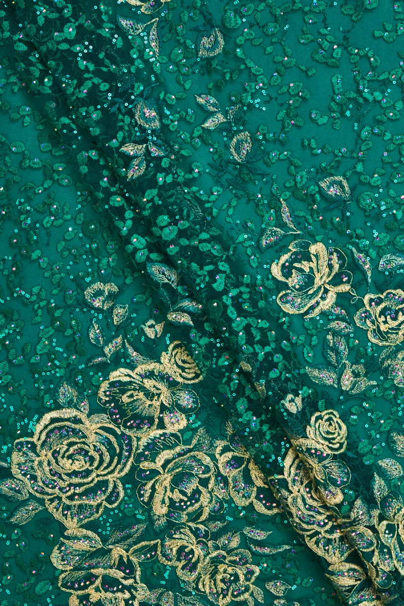 Itāļu stīvs tills ar klasiskām zaļām cilpām ar izšūtām zelta krāsas rozēm un mazām zaļām lapām, kas bagātīgi dekorētas ar zaigojošiem akmeņiem un maziem zaļiem fliteriem. Izšuvums sabiezē uz abām malām, tāpēc iesakām šūt pa perimetru. Audums ir ļoti efektīvs, caurspīdīgs (nepieciešama odere), neelastīgs un viegls. Akmeņi, kas novietoti uz auduma, skaisti spīd, radot ekskluzīvu auduma izskatu Fantastisks piedāvājums vakarkleitas, svārku vai blūzes šūšanai ļoti interesantā izdevumā.