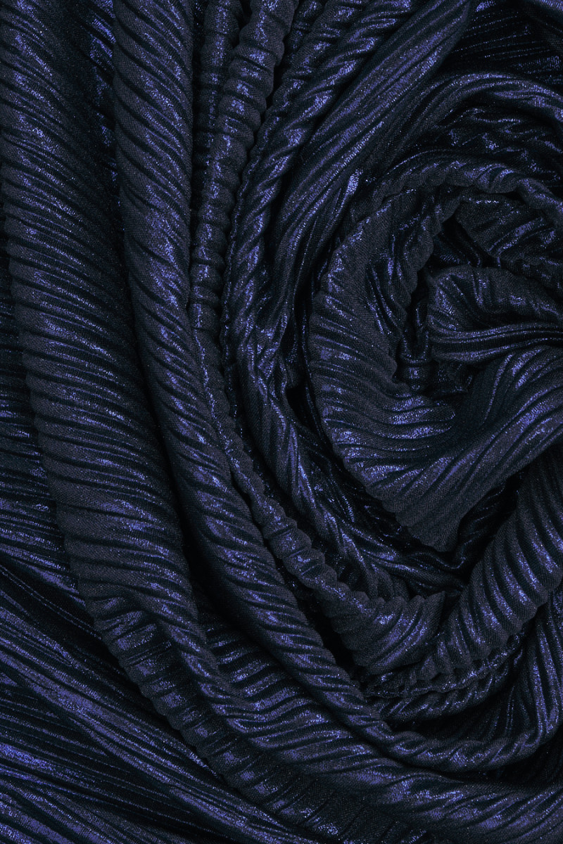 Iespaidīgs, spīdīgs audums, kas smalki krokots dziļā, tintes tumši zilā krāsā, kas iekrīt purpursarkanā krāsā.