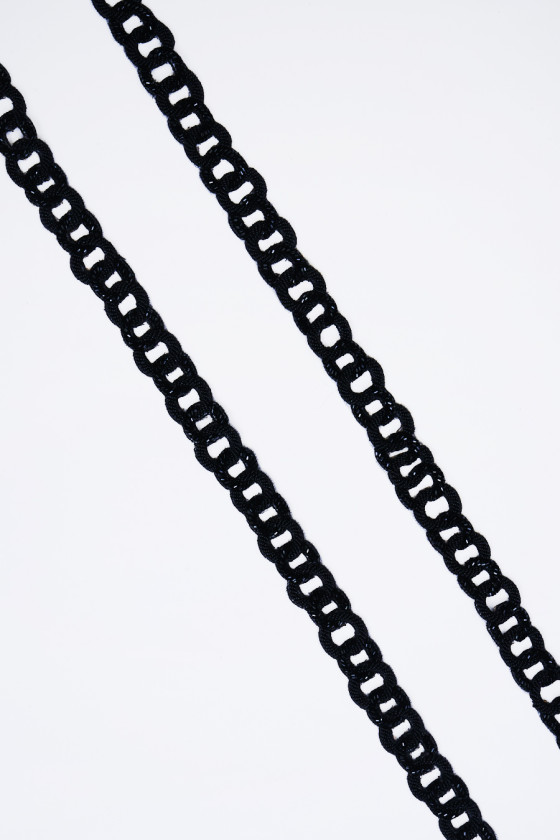 Itāļu galantērijas lente 50 cm garā un 2,5 cm platā kuponā. Oriģināls apaļu, savstarpēji savienotu cilpiņu motīvs, kas izgatavots pārmaiņus no divu veidu melnām pērlītēm. Ļoti elegants piedāvājums kleitas vai blūzes rotāšanai. Lente mūžīgā melnā faniem ar modernu vērpjot. Ja jums ir nepieciešams 1m lentes, pasūtiet 2 kuponus.