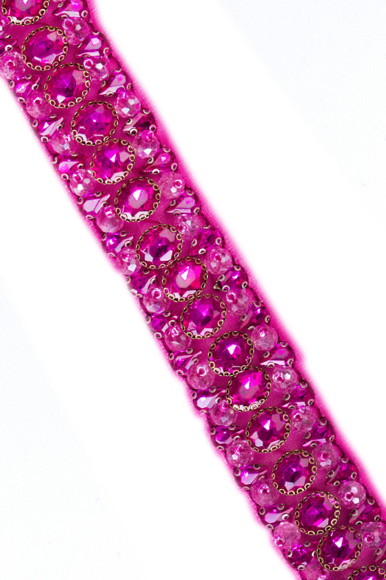 Itāļu galantērijas lente 50 cm garā un 2,5 cm platā kuponā. Skaists lielu, fuksijas dārgakmeņu raksts, kas ievietots vecā zelta krāsas metālā, gar tiem ir mazāki dimanta formas akmeņi fuksijas krāsā un apaļi, gaiši rozā akmeņi, kas pabeigti ar nelielu lodīti. Viss ir uzšūts uz fuksijas poliestera šifona. Ļoti elegants piedāvājums kleitas vai blūzes rotāšanai. Ja jums ir nepieciešams 1m lentes, pasūtiet 2 kuponus.