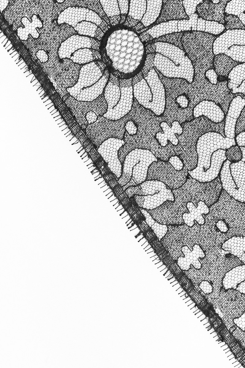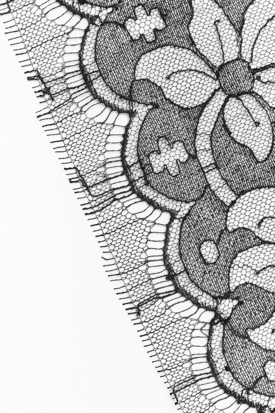 Itāļu galantērija - mežģīņu lente melnā krāsā, 25cm plata. Lente ar ļoti interesantu ziedu motīvu, vienā pusē tā ir pabeigta ar dekoratīvu zobu (lai to izgrieztu pats). Ļoti interesants piedāvājums gludu audumu apdarei.