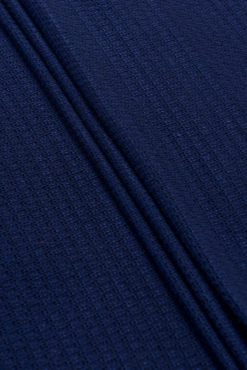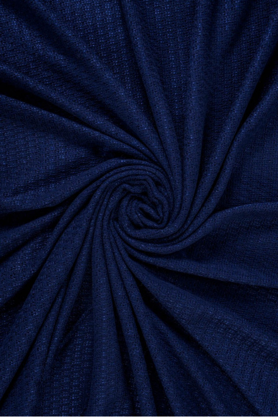 Tumši tumši zils džemperis trikotāžas audums ar brīvu ažūra austu, ļoti kaļams. Audums sastāv no vilnas un akrila pavedieniem. Mēs iesakām to džemperu, jaku, šalles šūšanai.